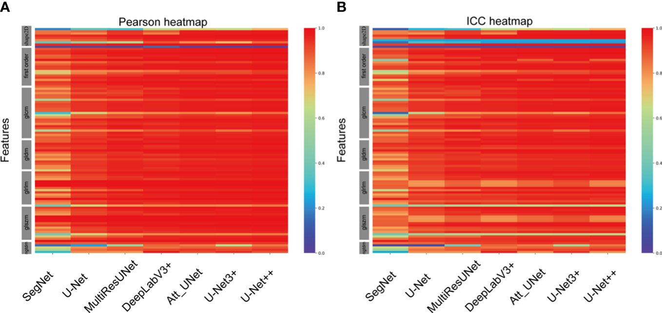 Heat maps of Pearson correlation and intraclass correlation coefficients for radiomics features extracted from CNN-based automatic segmentations.