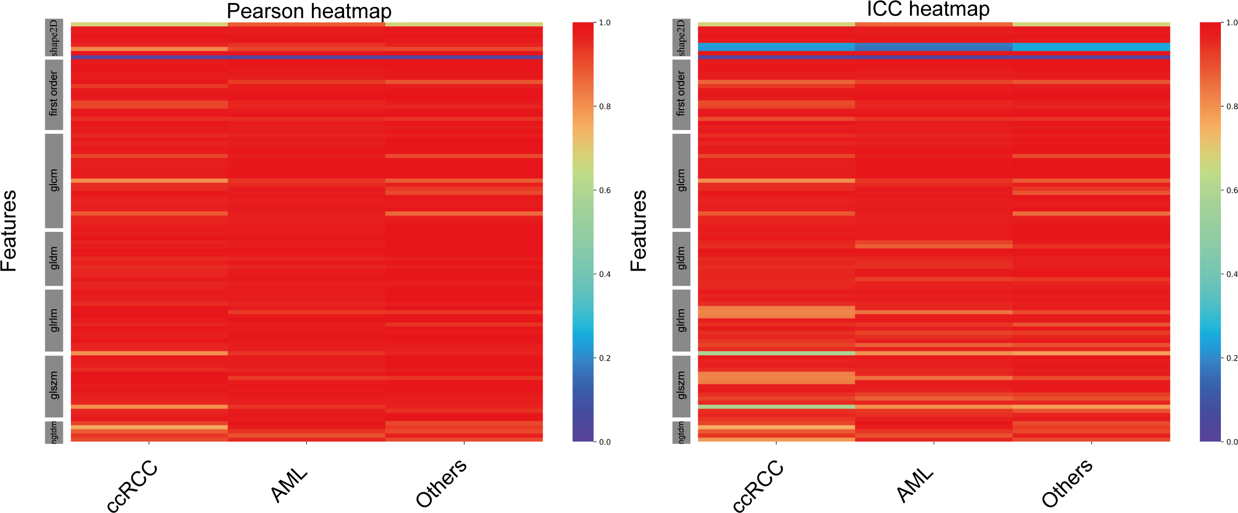 Heat maps of Pearson correlation and intraclass correlation coefficients for radiomics features extracted from manual segmentation and U-Net++ models based on automatic segmentation in different subtypes of renal tumor.