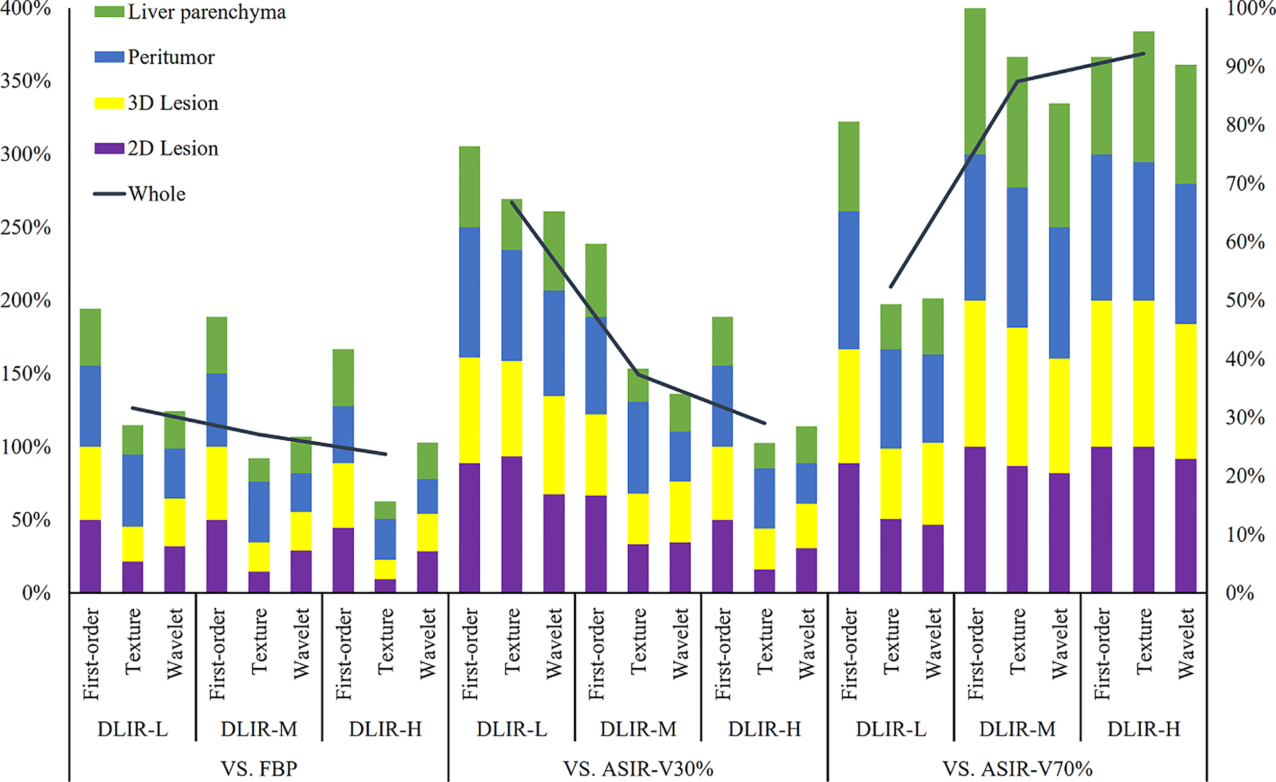 Different iterative algorithms and various iteration strengths had been verified to have an impact on the extraction of radiomic features (14–16). However, recent studies of deep learning image reconstruction algorithms had mainly explored their impact on image quality and radiation dose (17, 18), the impact of DLIR algorithms on radiomic features was still not well known. The purpose of this study was to evaluate the impact of different strengths of ASIR-V and DLIR compared to FBP on the CT imaging radiomic features of patients with liver tumors and to verify their stability in the quantitative analysis of contrast-enhanced CT.