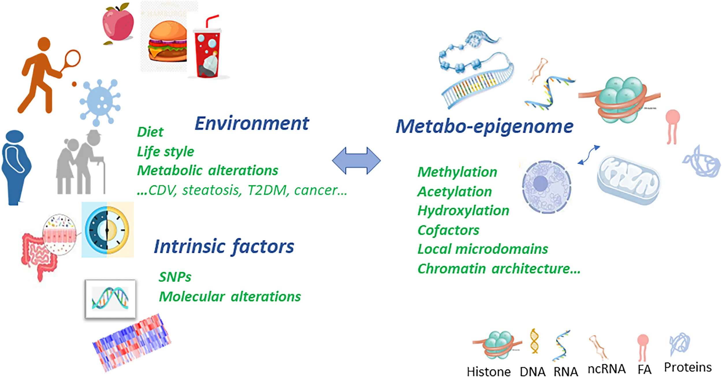 Metabolic and epigenetic imbalances result in disease. There are several factors that can cause an epigenetic imbalance and consequently different diseases. Some of these factors are intrinsic including genetic variations such as Single Nucleotide Polymorphism (SNPs) or DNA mutations caused by carcinogens and Reactive Oxygen Species (ROS); environmental factors including metabolic alterations such as obesity or ageing and lifestyle (unbalanced diet or sedentary lifestyle). This epigenetic imbalance leads to cardiovascular, neurological and cancer diseases.