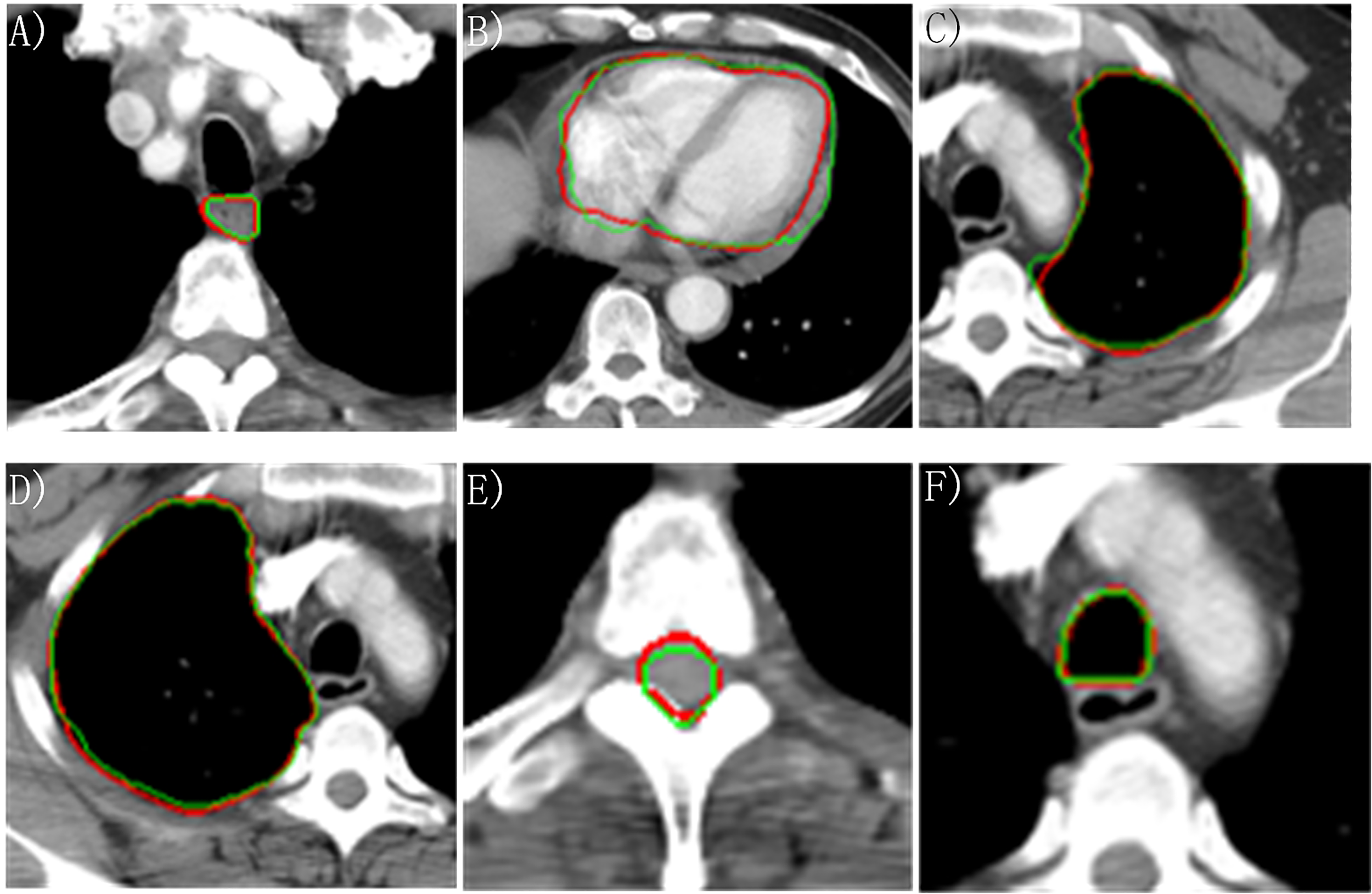 Manually and automatically segmented organs at risk based on the proposed model. Red line: manual contour; green line: automatic contour. (A) Esophagus; (B) Heart; (C) Left lung; (D) Right lung; (E) Cord; (F) Trachea.