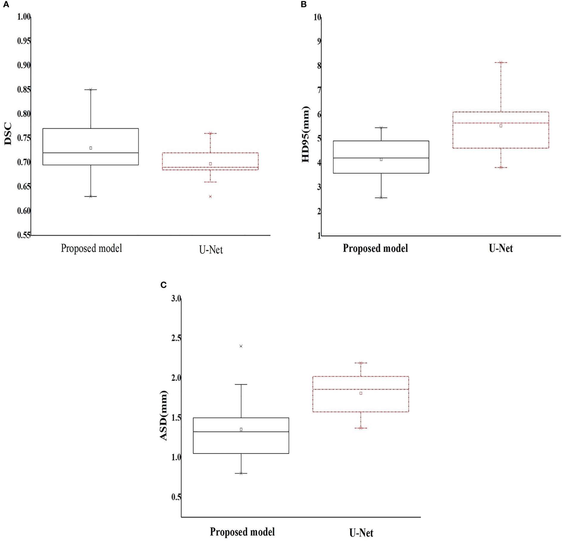 Box plot of the geometric metrics of the esophagus ((A) Dice similarity coefficient; (B) 95% Hausdorff distance; and (C) average surface distance).