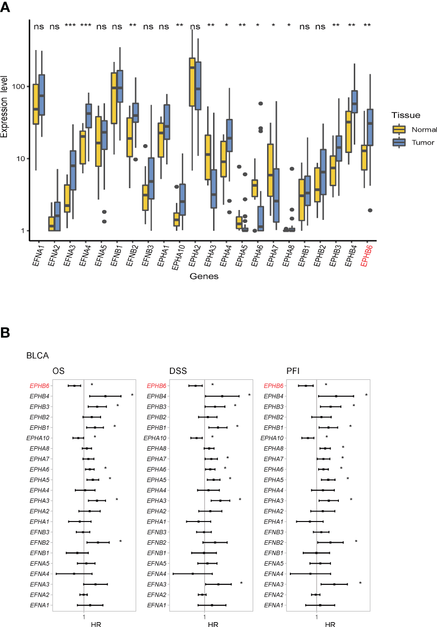 Expression and prognostic role of Eph receptors and EFN ligands in bladder cancer. (A) Difference in the mRNA expression level between bladder cancer tumor tissues and normal tissues in local bladder cancer cohort. (B) Forest plot for the association between Eph receptors and EFN ligands and survival by median cutoff in the TCGA-BLCA cohort; data were presented with HR and 95% CI. * p<0.05. OS, overall survival; DSS, disease-specific survival; PFI, progression-free interval; HR, hazard ratio. *p<0.05; **p<0.01; ***p<0.001; ns: non-significant.