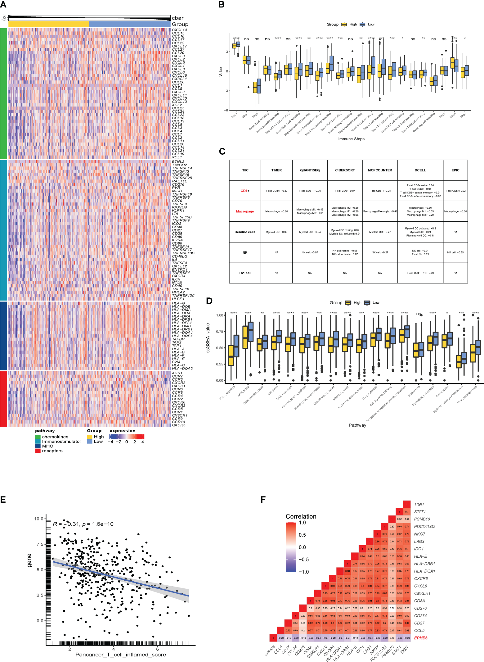 EPHB6 is associated with a cold immune microenvironment in bladder cancer. (A) Difference in the expression levels of immunomodulatory genes between the high- and low-EPHB6 groups in the TCGA-BLCA cohort. (B) Bar plots showing the difference in the activities of seven immune steps between the high- and low-EPHB6 groups in the TCGA-BLCA cohort. (C) Correlation between EPHB6 expression levels and tumor-infiltrated immune cells (TIICs) in bladder cancer. The levels of TIICs were analyzed by multiple algorithms, including TIMER, CIBERSOFT, QUANTISEQ, MCPCOUNTER, XCELL and EPIC. (D) Bar plots revealing the difference in the immune-related signal pathways between the high- and low-EPHB6 groups. (E) Correlation between EPHB6 expression level and T cell inflamed score. (F) Correlation between EPHB6 and each individual T cell inflamed signature-related gene expression. *p<0.05; **p<0.01; ***p<0.001; ****p<0.0001; ns, non-significant.