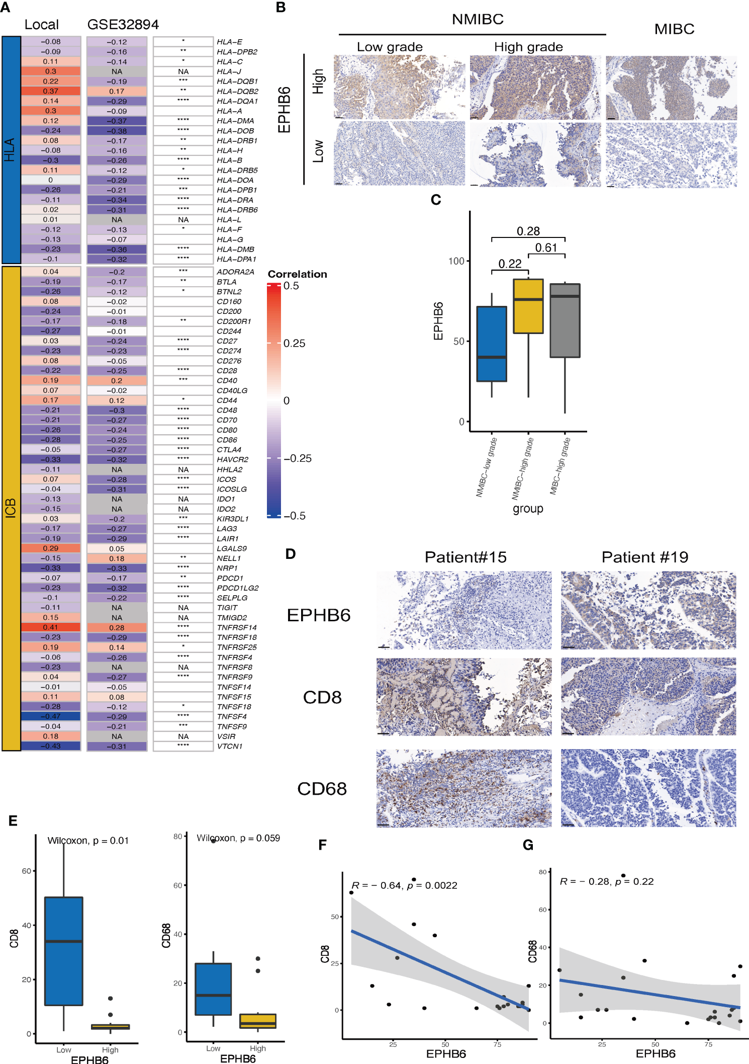 Validation of the association between EPHB6 and immunology feature in local and other bladder cancer datasets. (A) Correlation analysis of the mRNA expression levels of immunomodulatory genes (HLA and ICBs) and EPHB6 in local bladder cancer (BLCA) and GSE32894 datasets. (B) Immunohistochemical staining of EPHB6 in patients with NMIBC-low grade (left panel), NMIBC-high grade (middle panel), and MIBC (right panel) from local cohort. (C) Bar plot showing the difference in EPHB6 protein expression level in patients with NMIBC-low grade, NMIBC-high grade, and MIBC from local cohort. The images were captured at a magnification of 200, and a scale bar indicating 50 μm was included in the left bottom corner of each image. (D) Representative image of immunohistochemical staining of EPHB6, CD8 and CD68 in patients with high- and low-EPHB6 protein expression level. The images were captured at a magnification of 200, and a scale bar indicating 50 μm was included in each image’s left bottom corner. (E) Bar plot showing the difference in the CD8 and CD68 protein expression levels in patients with high- and low-EPHB6 protein expression level. Correlation analysis of the protein expression levels of EPHB6 and CD8 (F) or CD68 (G) in BLCA patients from local cohort. HLA, human leukocyte antigens; ICB, immune checkpoint; NMIBC, non-muscle invasive bladder cancer; MIBC, muscle invasive bladder cancer. *p<0.05; **p<0.01; ***p<0.001; ****p<0.0001; NA: not applicable.