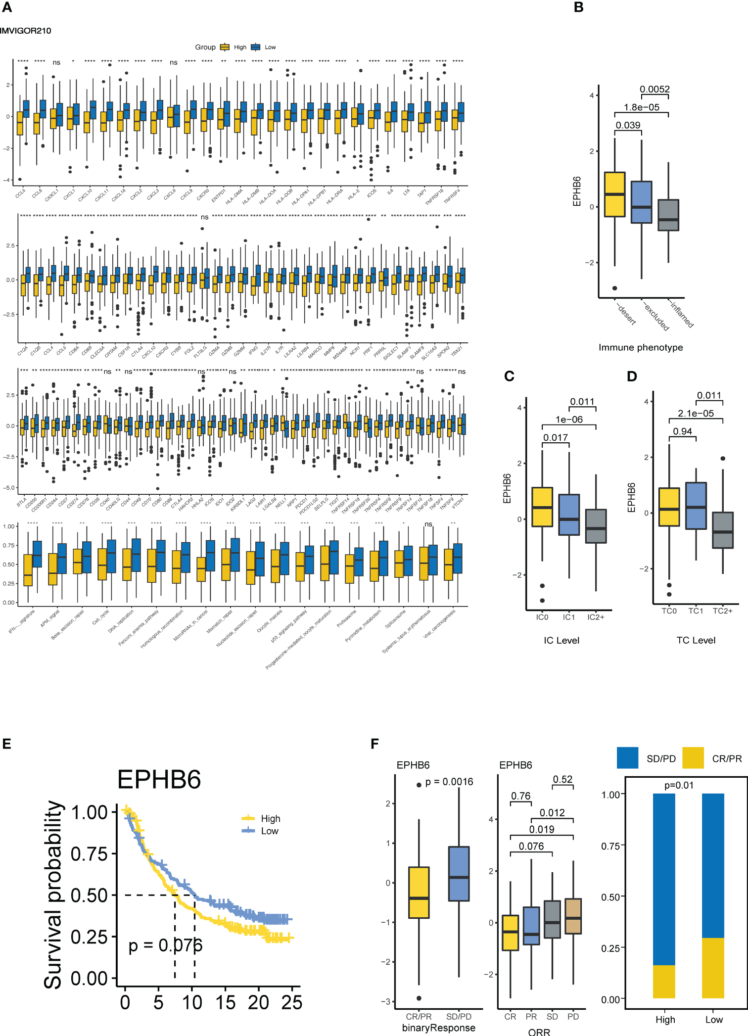 EPHB6 is associated with immunotherapy response in bladder cancer. (A) Difference in the expression levels of immunomodulatory genes between high- and low-EPHB6 groups in Imvigor210 cohort. Difference in the EPHB6 mRNA expression level between groups with various immune phenotypes (B), PD-L1 expression in immune cells (C) PD-L1 expression in tumor cells (D). (E) Kaplan-Meyer plot comparing patients with high- or low-EPHB6 expression levels treated with immunotherapy. (F) Difference in the EPHB6 mRNA expression level between responders (CR/PR) and non-responders (SD/PD) treated with immunotherapy. IC: PD-L1 immunohistochemistry levels in immune cells: IC0 (<1%); IC1(≥1% and <5%); IC2+ (≥5%). TC: PD-L1 immunohistochemistry levels in tumor cells TC0 (<1%); TC1 (≥1% and <5%); TC2+ (≥5%); IC0 (<1%); IC1 (≥1% and <5%); IC2+ (≥5%); CR, complete response; PR, partial response; SD, stable disease; PD, progressive disease. *p<0.05; **p<0.01; ***p<0.001; ****p<0.0001; ns, non-significant.