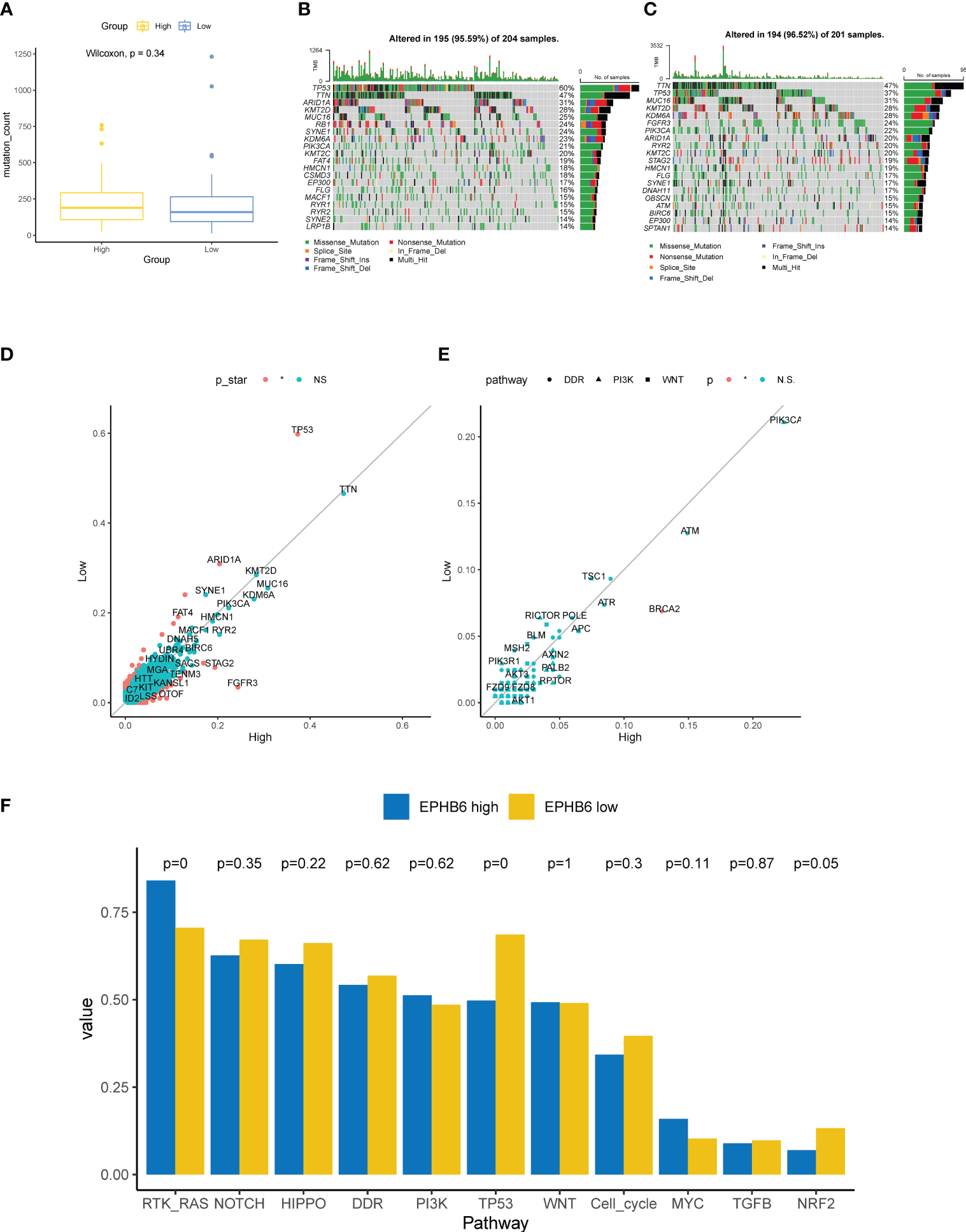 Genomic characteristics associated with EPHB6. (A) Difference in the mutation counts level between high- and low-EPHB6 group. Prevalent mutated genes in high- (B) and low-EPHB6 group (C). (D) Difference in the prevalence of mutated genes between high- and low-EPHB6 group. Genes colored in red were those significantly differed (p<0.05). (E) Difference in the prevalence of genes involved in DDR, PI3K or WNT signaling pathways between high- and low-EPHB6 group. (F) Difference in the mutated signaling pathways between high- and low-EPHB6 group.