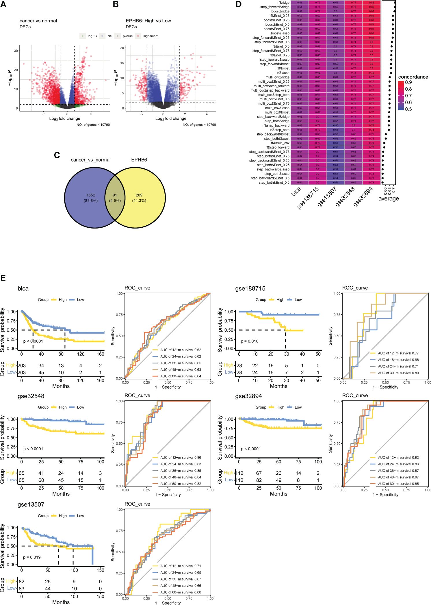Establish a prognostic signature based on EPHB6 expression feature in bladder cancer. (A) Differentially expressed genes (DEGs) between tumor and normal bladder tissues as showing by the volcano plot. (B) Volcano plot showing the DEGs between high- and low-EPHB6 group. (C) Veen plot showing the shared genes. (D) Combination of machine learning algorithms for establishing EPHB6 related genes (EBGs) signatures. The C-index of each model was calculated across bladder cancer datasets, including TCGA-BLCA, GSE188715, GSE13507, GSE 32548 and GSE32894. (E) Kaplan-Meyer plots and time-dependent ROC curve for predicting survivals at 1- to 5-years in TCGA-BLCA, GSE188715, GSE13507, GSE 32548 and GSE32894 datasets.
