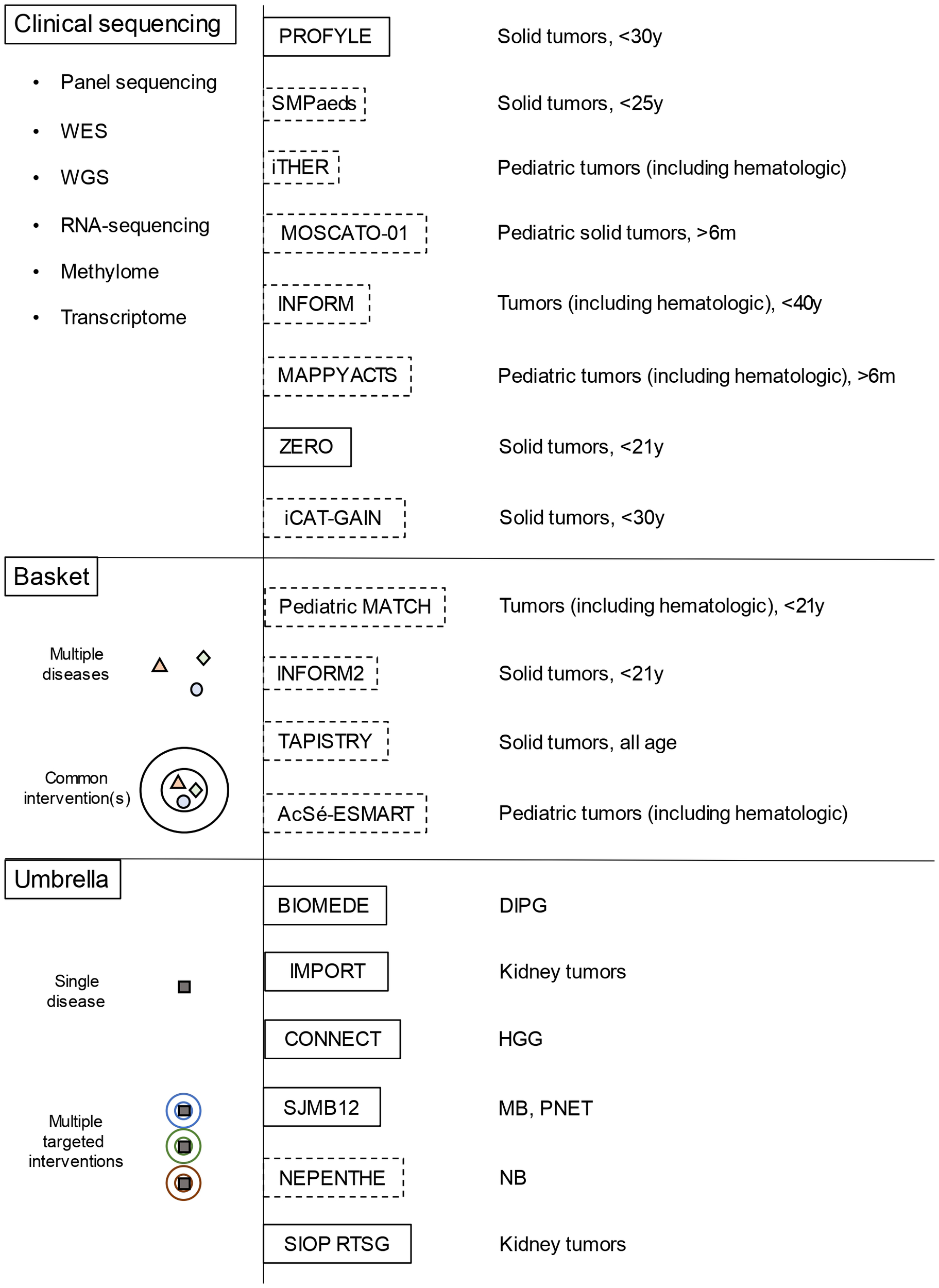 Overview of the main molecular profiling platforms and of basket/umbrella trials for childhood solid cancer (dotted lines represent platforms/trials for relapsed/refractory tumors, while the continuous lines those for newly diagnosed tumors) WES, whole-exome sequencing; WGS, whole-genome sequencing; DIPG, diffuse intrinsic pontine glioma; MB, medulloblastoma; NB, neuroblastoma; HGG, high grade gliomas; PNET, primitive neuroectodermal tumors.