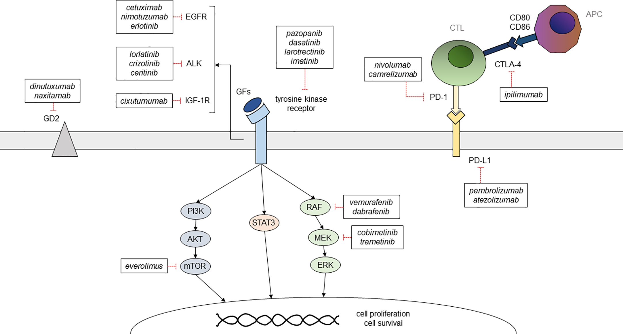 Summary of the main targetable pathways in childhood solid cancer and of the available therapeutic options GFs, growth factors; CTL, cytotoxic T lymphocyte; APC, antigen presenting cell.