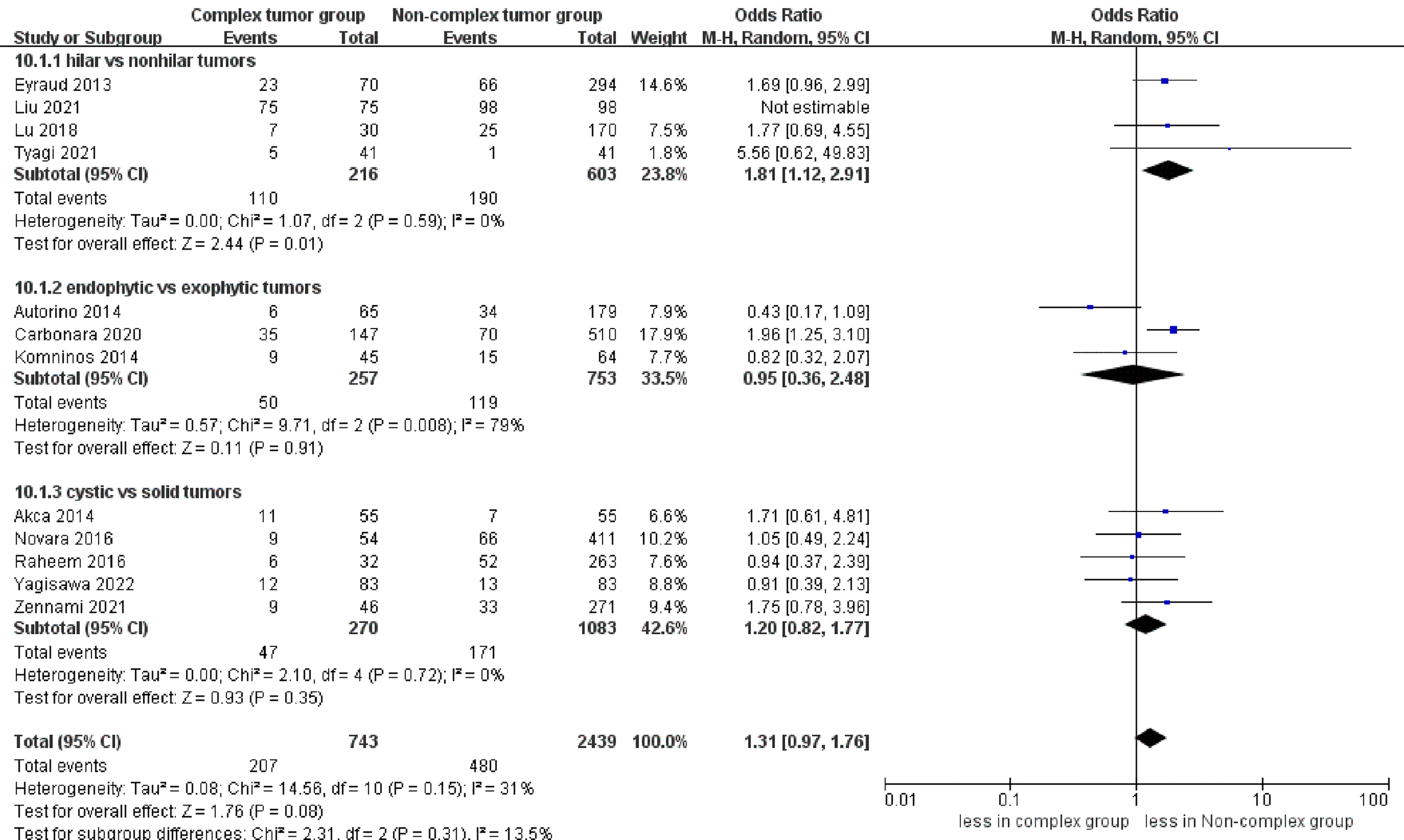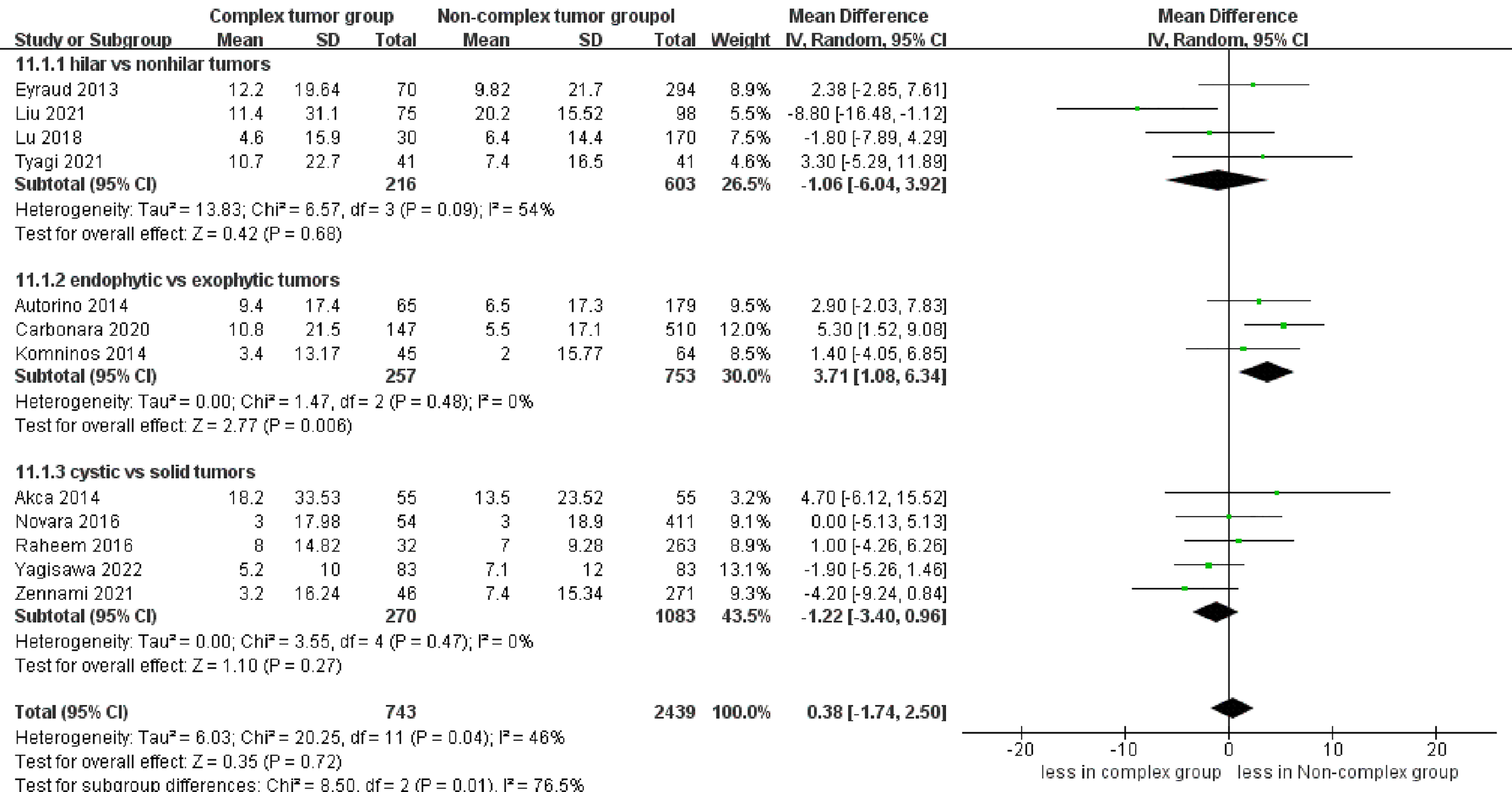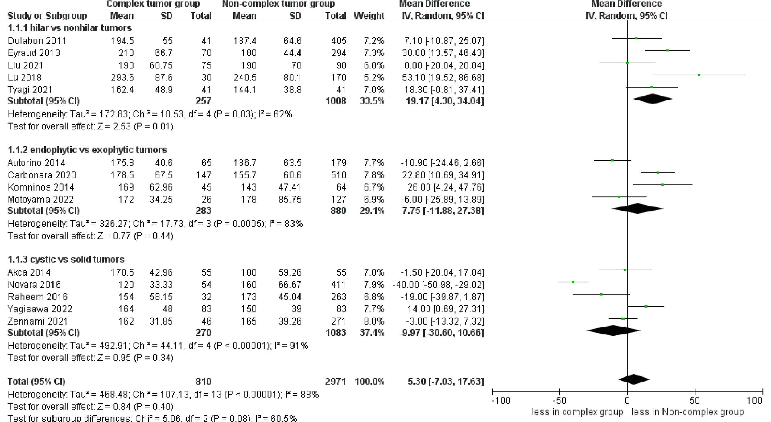 A subgroup analysis was performed to compare the different tumor types: renal hilar vs. renal nonhilar tumors, endophytic vs. exophytic renal tumors, and cystic vs. solid renal tumors.