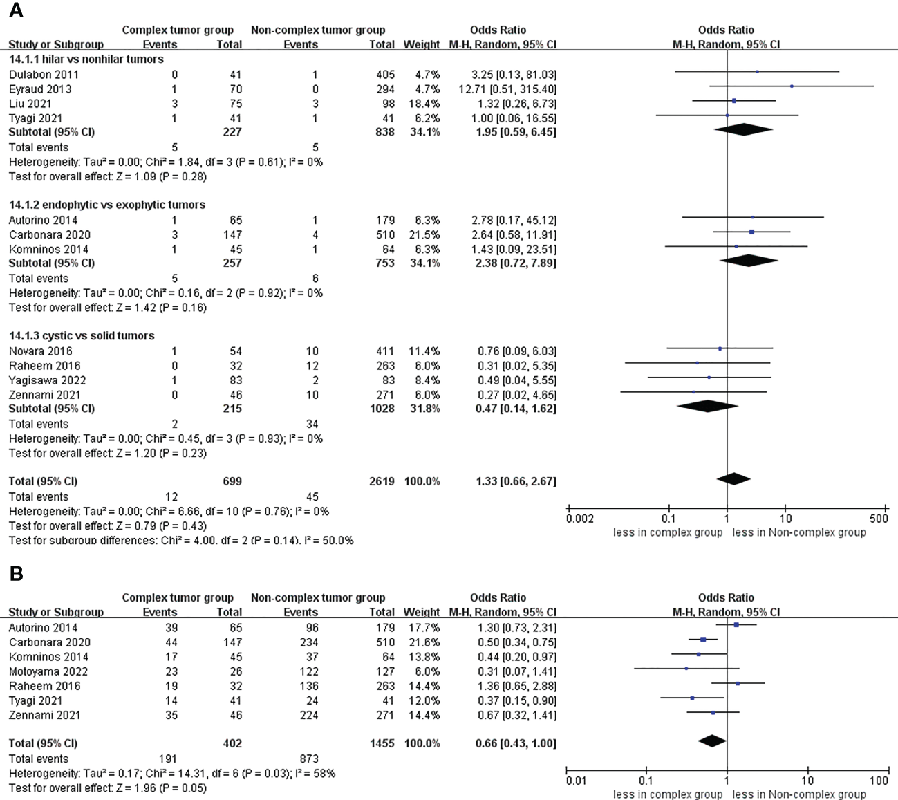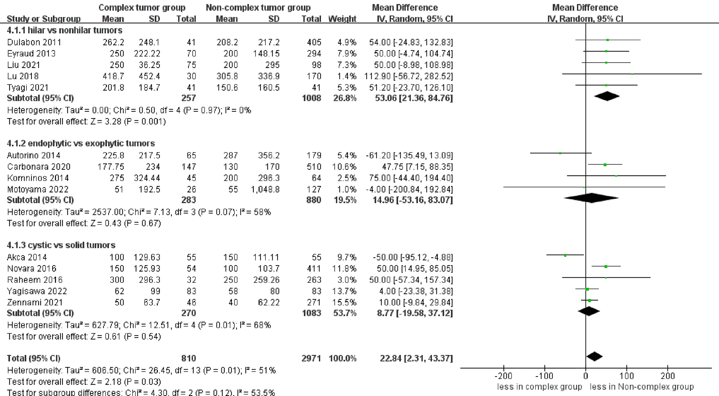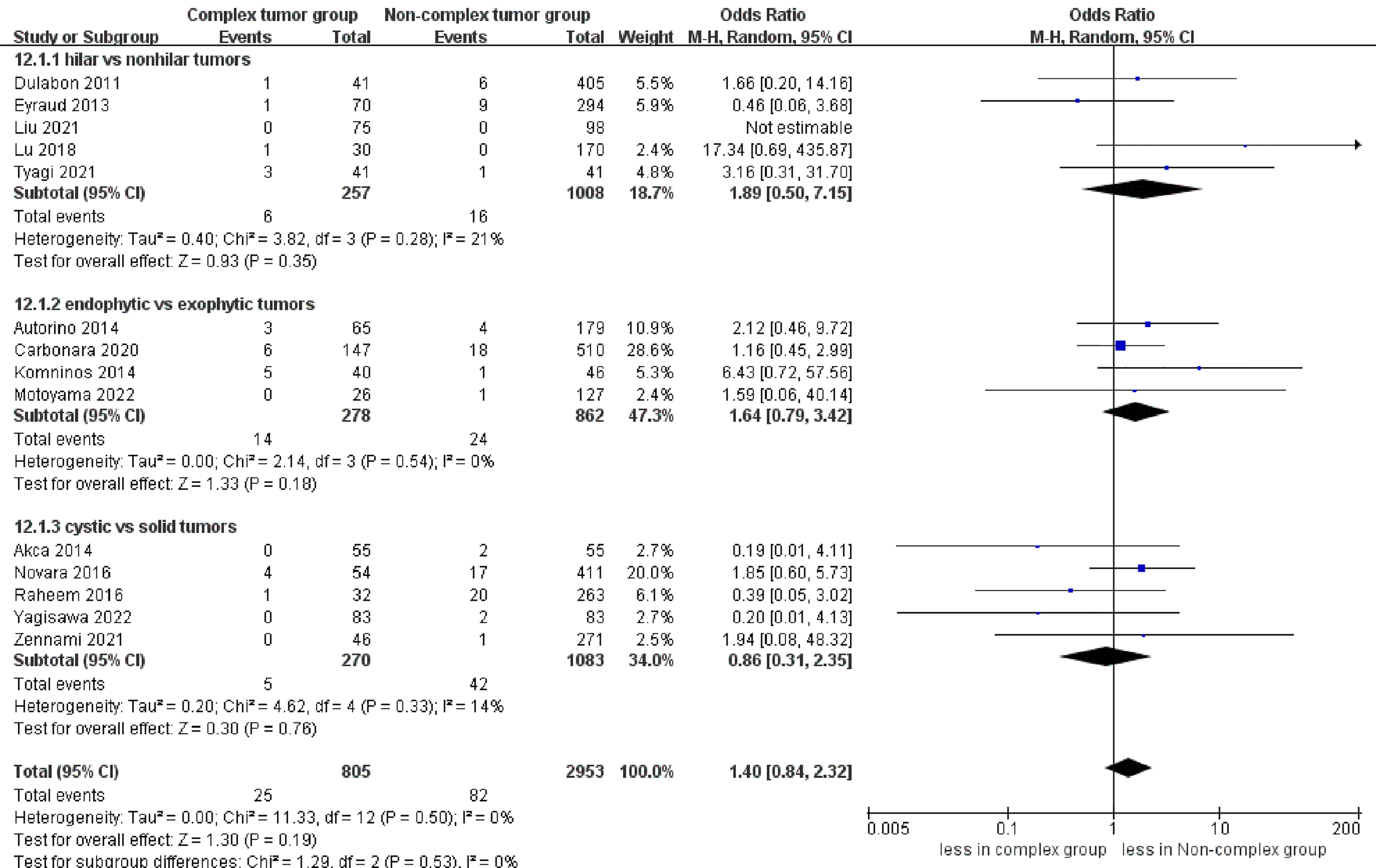 In total, 14 comparative trials, including 3758 patients were enrolled. Compared to non-complex tumors, complex tumors were associated with a significantly longer warm ischemia time (WMD 3.67 min, 95% CI 1.78, 5.57; p = 0.0001), more blood loss (WMD 22.84 mL, 95% CI 2.31, 43.37; p = 0.03), and a higher rate of major complications (OR 2.35, 95% CI 1.50, 3.67; p = 0.0002). However, no statistically significant differences were found between the two groups in operative time, length of stay, transfusion rates, conversion to open nephrectomy and radical nephrectomy rates, estimated glomerular filtration rate (eGFR) decline, intraoperative complication, overall complication, positive surgical margins (PSM), local recurrence, and trifecta achievement.