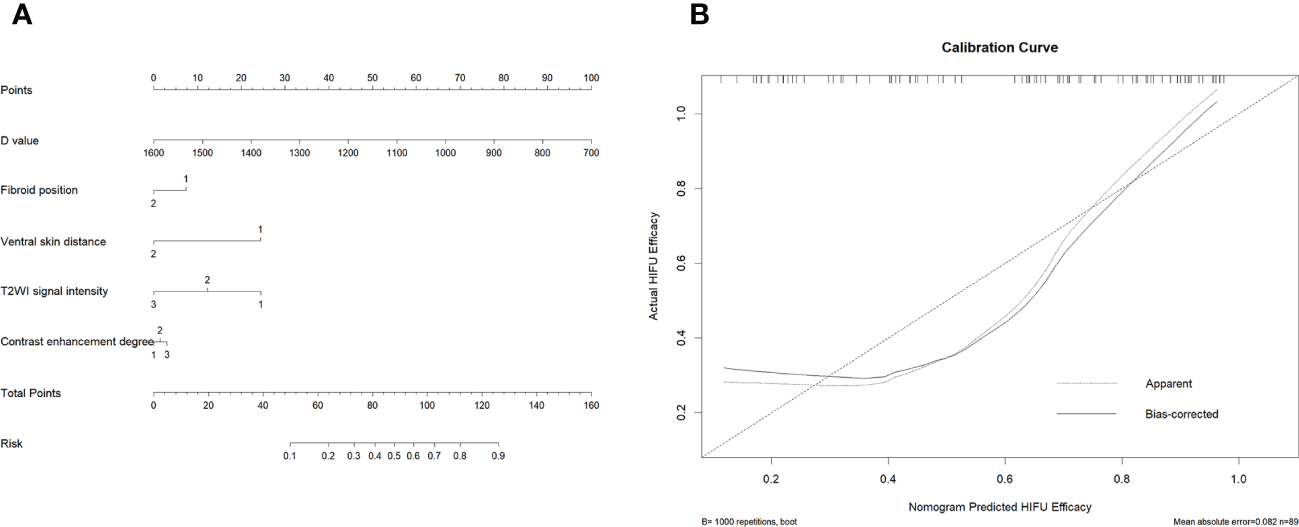 Reproducibility of individual parameters by radiologists was assessed by calculating the intraclass correlation coefficient (ICC) and ICC ≥ 0.75 indicates good reliability. Based on normality of data distribution, continuous variables were analyzed using the independent sample t-test or the Mann-Whitney U test. Categorical variables were analyzed using the chi square test or the Wilcoxon’s rank sum test. Then, a multivariate logistic regression model was constructed using the statistically significant variables from the different analyses to comprehensively evaluate the predictors of the efficacy of HIFU ablation. The receiver operating characteristic (ROC) curve was drawn, and the area under the ROC curve (AUC), sensitivity, and specificity were calculated to assess the performance of IVIM-DWI parameters in predicting the efficacy of ablation. A nomograph was constructed to visualize the prediction model. The Hosmer-Lemeshow (H-L) test and calibration curves were used to evaluate the fitting of the model. p<0.05 was set as the threshold for significance and all analyses were performed using the SPSS (IBM SPSS Statistics 27) and R (R 4.2.2) software.