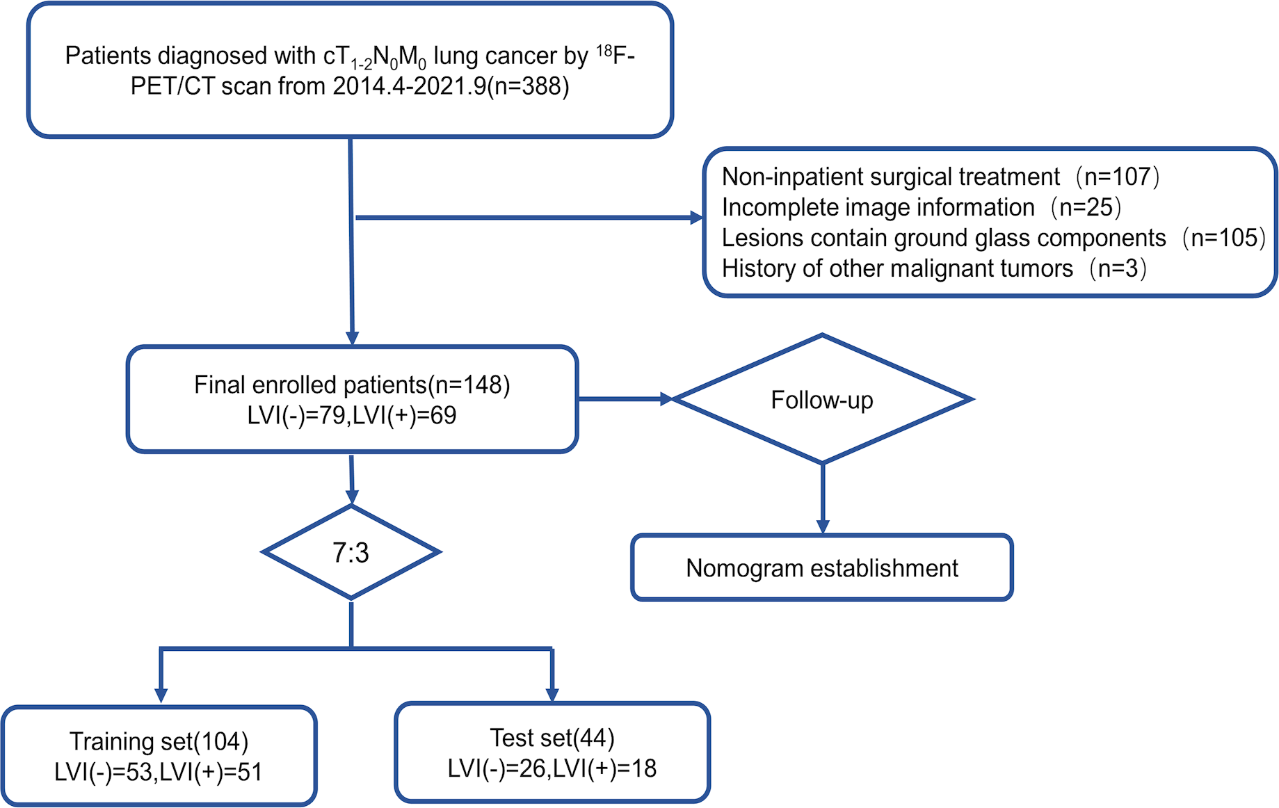 The Institutional Review Board of our institution approved this retrospective study, which waived the requirement for signed informed consent forms. We retrospectively collected 272 lung cancer cases who underwent PET/CT examination at the PET/CT unit in the Affiliated Cancer Hospital of Shandong First Medical University, China, between April 2014 and September 2021; of all the screened cases, 148 fulfilled the criteria. The inclusion criteria were: 1. patients with pathologically confirmed cT1–2N0M0 lung cancer; 2. patients who underwent PET/CT scan before surgery; 3. patients in whom PET/CT showed positive FDG uptake at the primary tumor site. Exclusion criteria were: 1. CT in patients demonstrated lesions showing ground glass components; 2. patients had received preoperative antitumor therapy; 3. Patients did not undergo surgery at our institution earlier;4. patients with other malignancies; 5. patients with other lung diseases that could affect image analysis. Figure 1 illustrates the screening process of patients who were stratified into training and validation groups (7:3 ratio). Training set and validation set samples were applied in predicting the training model and in evaluating model performance, respectively.
