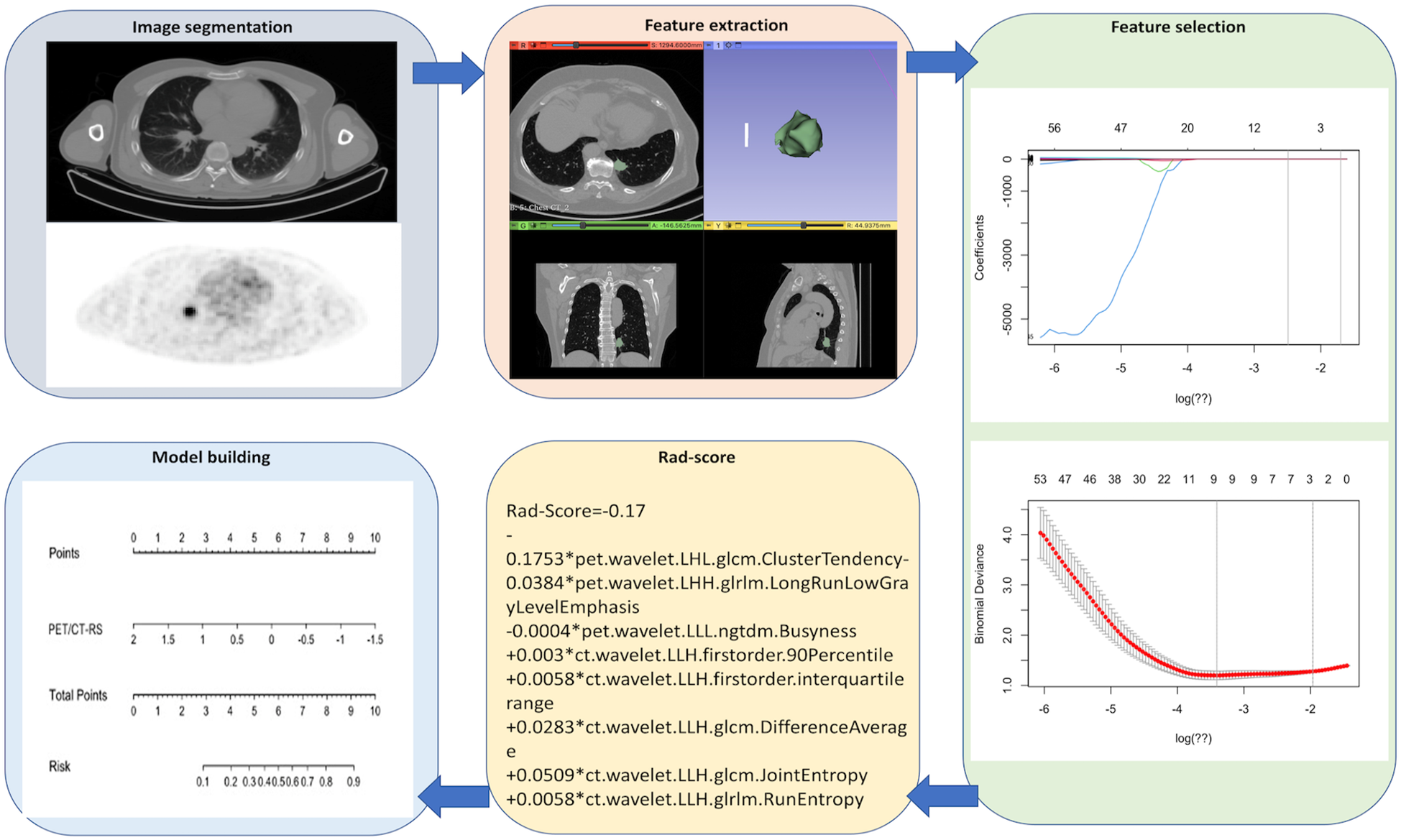NSCLC, non-small cell lung cancer; LVI, lymphovascular invasion; OS, overall survival; DFS, disease-free survival; CT, computed tomography; PET, positron emission tomography; PET-CT, positron emission tomography-computed tomography; SUVmax, maximum standardized uptake value; SUVmean, mean standardized uptake value; TLG, total lesion glycolysis; MTV, metabolic tumor volume; ICC, intraclass correlation coefficient; Rad-score, Radiomics Score; ROI, region of Interest; C-index, Harrell concordance index; DCA curve, decision curve analysis curve; LASSO, least absolute shrinkage and selection operator; ROC, receiver operator characteristic curve; AUC, area under receiver-operating characteristic curve.