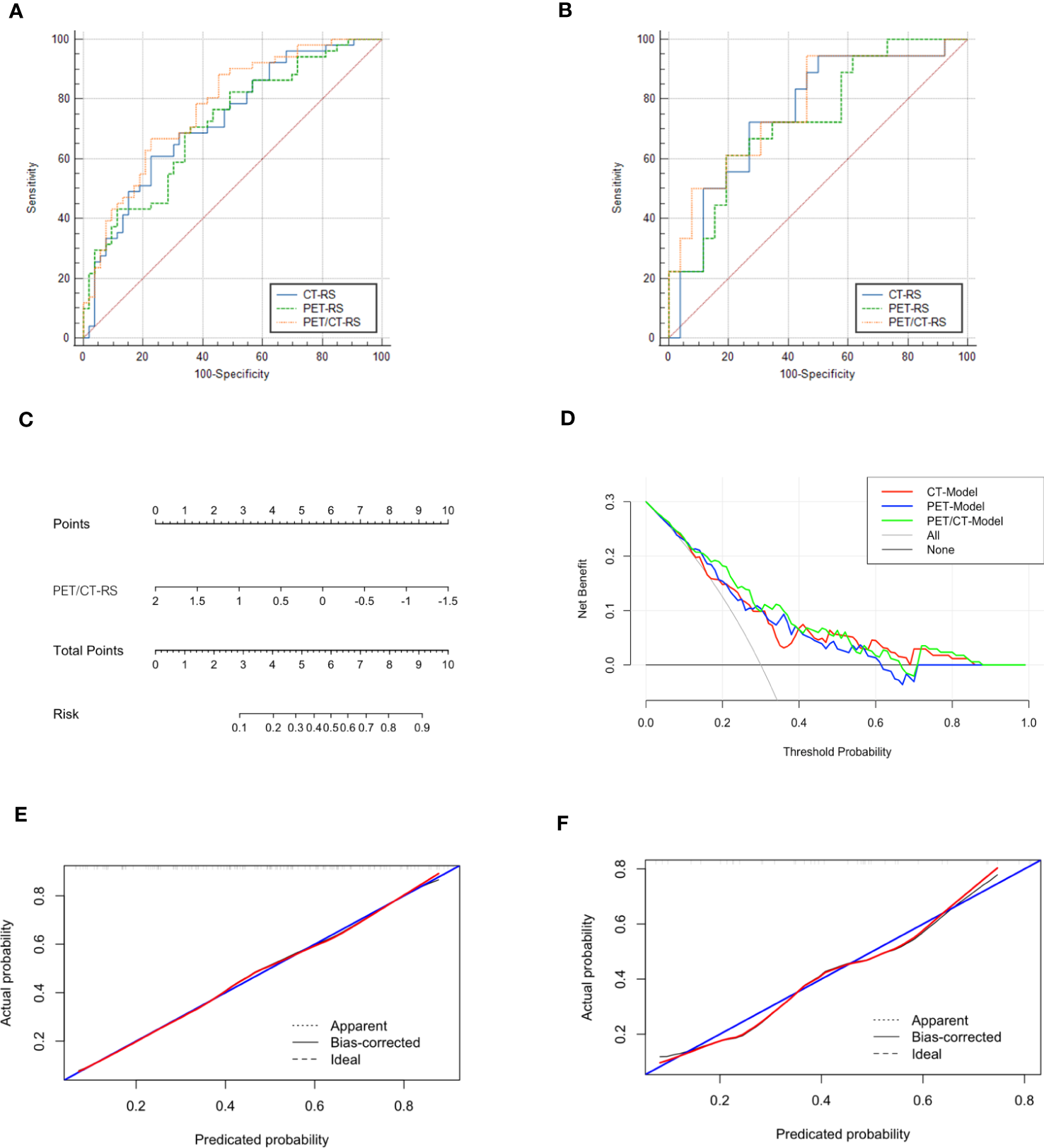 The ROC analysis demonstrated that PET/CT-RS (AUCs were 0.773 and 0.774 for training and validation sets) outperformed both CT-RS(AUCs, 0.727 and 0.752) and PET-RS(AUCs, 0.715 and 0.733). A PET/CT radiology nomogram (PET/CT-model) was developed to estimate LVI; the model demonstrated conspicuous prediction performance for training (C-index, 0.766; 95%CI, 0.728–0.805) and validation sets (C-index, 0.774; 95%CI, 0.702–0.846). Besides, decision curve analysis and calibration curve showed that PET/CT-model provided clinically beneficial effects. Disease-free survival and overall survival varied significantly between LVI and non-LVI cases (P<0.001).