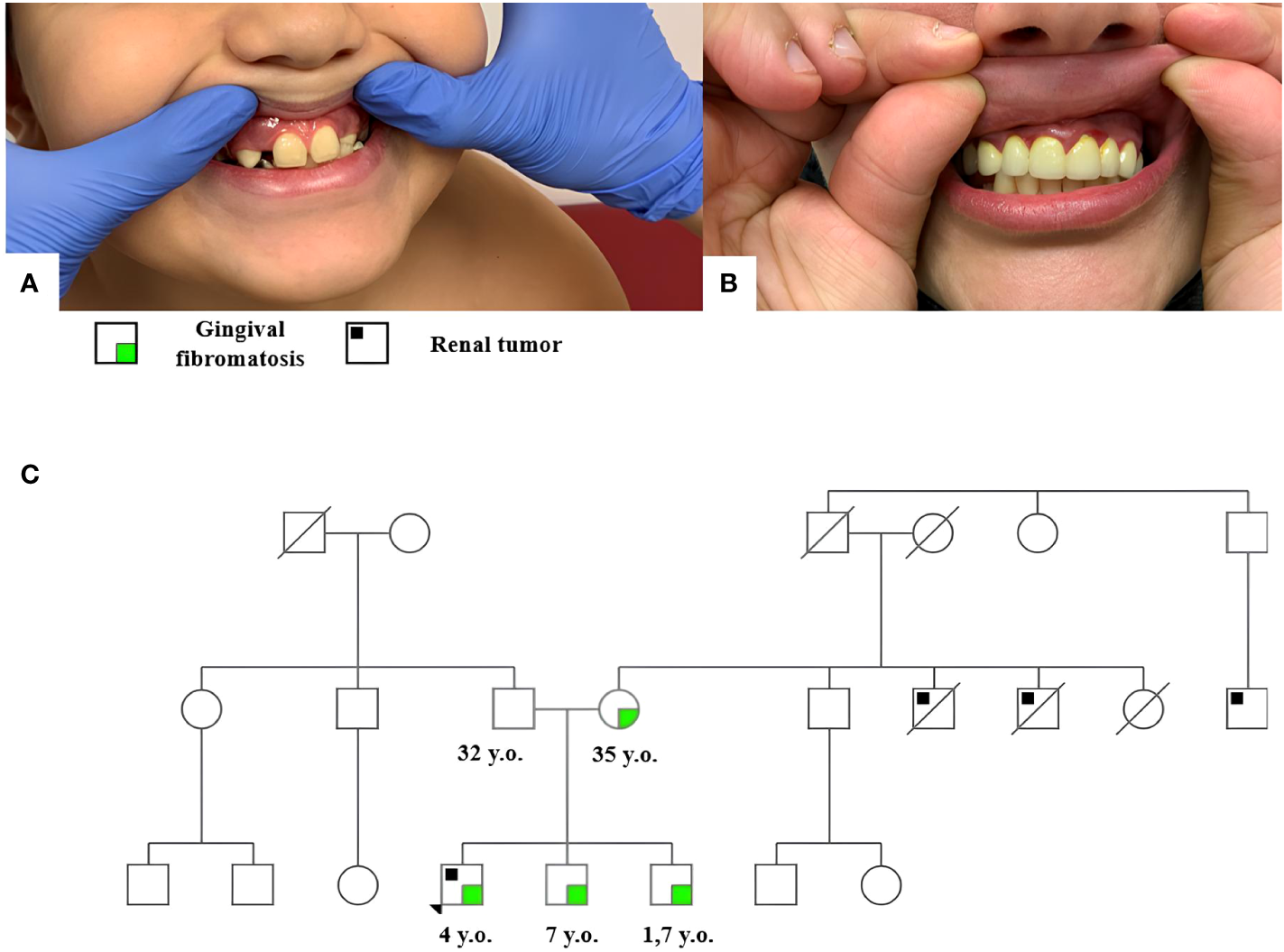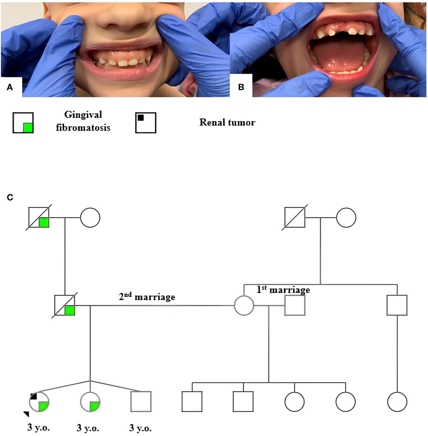 Clinical examination revealed hyperplasia of the maxillary gums typical of GFM (Figure 1A). Similar hyperplastic changes are observed in the mother (Figure 1B) and both brothers of the patient. The family tree is shown in Figure 1C.