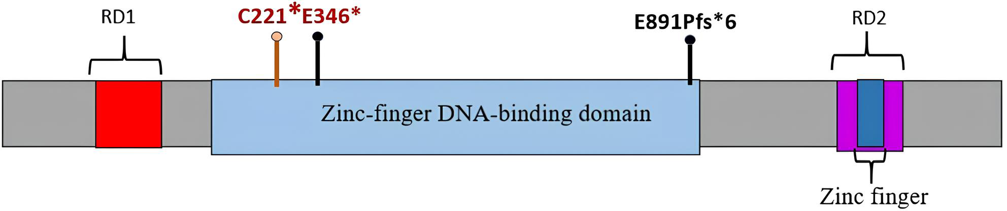 REST protein with zinc-finger DNA-binding domain and repressor domains RD1 and RD2. Germline mutations identified in patients 1 and 2 are marked with black pins; mutations (germline and somatic) identified in patient 1 are labeled in red.