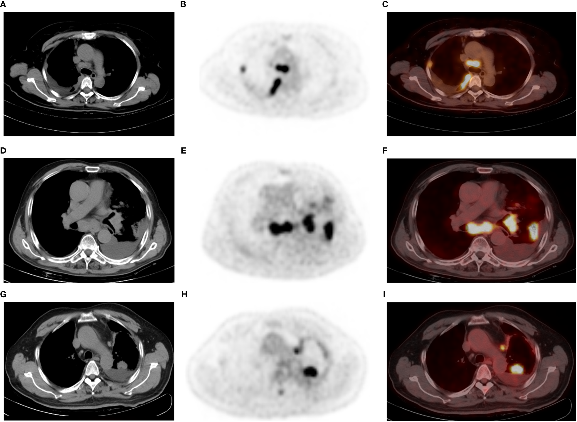 A 52-year-old man with poorly differentiated lung adenocarcinoma and right-sided malignant pleural effusion (A–C). Axial CT (A) revealing effusion in the right pleural cavity, and axial 18F-FDG PET (B) and fused PET/CT (C) revealing nodular 18F-FDG uptake (SUVmax 4.4) in the same pleural region. Thoracentesis-based pathology confirmed MPE caused by metastatic adenocarcinoma. A 77-year-old man with lung adenocarcinoma and left-sided BPE (D–F). Pleural fluid cytologic findings were negative, without recurrence of pleural abnormalities on follow-up. Axial CT (D) revealing a left peripheral lung cancer with left pleural effusion, as well as pneumonia, mediastinal, and left hilar lymphadenopathy. Axial PET (E) and fused PET/CT (F) revealing hypermetabolic areas in the tumors without abnormal FDG uptake in the pleura. A 65-year-old man with left lung adenocarcinoma and left-sided MPE (G–I), who did not have an enlarged lymph node in the mediastinum or hilar region. Axial CT (G), PET (H) and fused PET/CT (I) revealing a left PE, lung mass (SUVmax: 13.9), and mediastinal pleural thickening (thickness: 5.6 mm and SUVmax: 4.1). PE cytology confirmed MPE. Note that the largest thoracic lymph node of this patient is located next to the aortic arch with a short diameter of 7 mm and SUVmax 6.5.