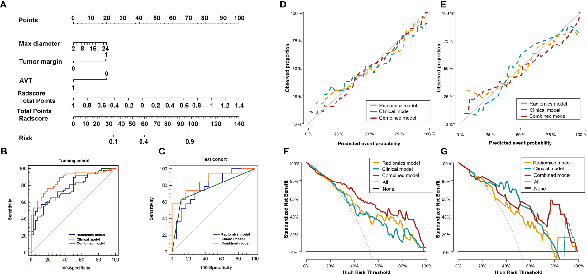 Twenty-one clinical factors and radiographic scores partially referenced from Kim et al. (29) and Cuiping Zhou et al. (30) including sex, age, max diameter, tumor location, growth pattern, ulceration, air density within the mass, surrounding fat space, tumor margin, tumor shape, direct organ invasion, density, calcification, intratumoral hemorrhage, necrosis, enlarged vessels around the tumor, apparent vessels in the tumor (AVT), enhancement pattern, lymphadenopathy, liver metastasis and level of enhancement were evaluated retrospectively by two radiologists independently and blinded to the type of GIST, with disagreements judged by a more senior radiologist. Detailed definitions of the above variables are provided in Supplementary Text S3. Then, clinical and radiographic scores were compared between patients with KIT exon 11 deletions and patients without KIT exon 11 deletions in the training and test cohorts and used to build a clinical model.