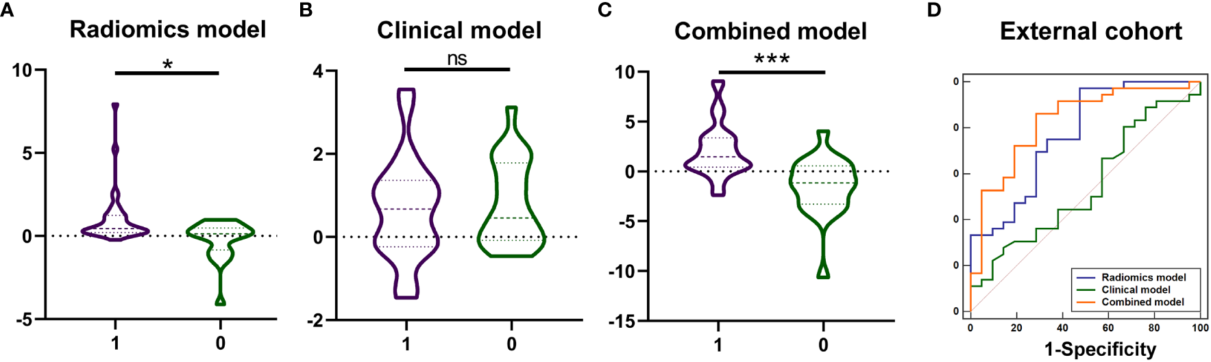 To ensure high replication of the model, diagnostic performances were evaluated of the radiomics model, clinical model, and combined model in the external cohort.