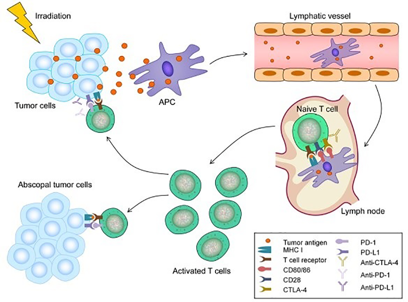 Mechanism of the abscopal effect. Radiotherapy (RT) can lead to immunogenic cell death and the release of tumor antigens by irradiated tumor cells. These neoantigens are taken up by antigen-presenting cells (APCs), such as dendritic cells (DCs) and phagocytic cells. The APCs interact with tumor antigens and then migrate to the lymph nodes where they present antigens to T cells, a process that is mediated by the MHC pathway and other co-stimulatory signals, such as CD80 and CD28. After activation by multiple signals, T cells, especially the CD8+ T cells, are activated and begin to propagate. As a result, activated effector T cells exit the lymph nodes and home to tumors, including primary tumors and non-irradiated tumor metastases, to exert their effect of killing tumor cells. However, cytotoxic T lymphocyte-associated antigen 4 (CTLA-4) competitively combines with CD80/86 and inhibits the activation of T cells. Following T cell activation, programmed cell death 1 (PD-1) receptors that are expressed on the T cell surface bind primarily to programmed death-ligand 1 (PD-L1) and inhibit immune responses. The administration of immune checkpoint blockades of CTLA-1, PD-1, and PD-L1 can enhance the anti-tumor immunity of RT (92).