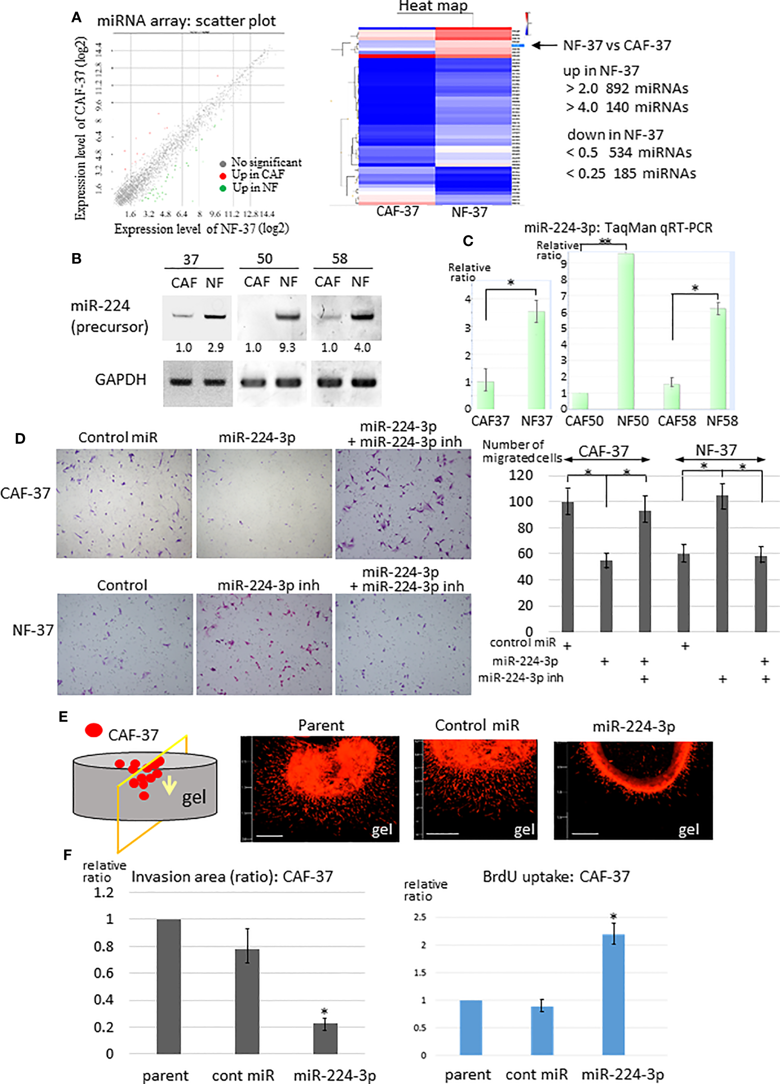 Because exaggerated invasion of CAFs guides cancer cells and promotes tumor expansion (33), we examined the effects of miR-224-3p on migration and invasion of fibroblasts. A miR-224-3p mimic (miRIDIAN miR-224-3p) was introduced into CAF-37 cells to determine whether it altered migration and invasion. MiR-224-3p decreased migration of CAF-37 significantly in a Transwell assay (Figure 1D, upper panel). By contrast, the inhibitor of miR-224-3p promoted migration of NF-37 cells (Figure 1D, bottom panel). In addition, a 3D gel invasion assay of CAFs revealed that although miR-224-3p mimic decreased invasion by CAF-37 cells (Figures 1E, F, Figure S2A top), it increased proliferation, as determined by measuring BrdU uptake (Figure 1G).