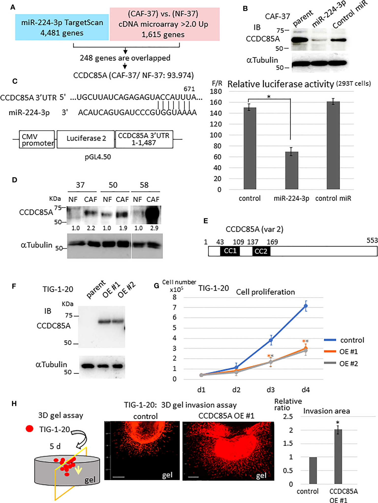 Next, we examined the target genes of miR-224-3p in NFs. For this purpose, target genes predicted by TargetScan Human 8.0 (34) were checked against the list of genes differentially expressed by CAF-37 and NF-37 cells (determined by cDNA microarray analysis) (33) (Figure 2A). Among 4,481 candidate targets of miR-224-3p, 248 that were upregulated in CAF-37 relative to NF-37 (ratio >2.0) were selected. Among them, ccdc85A, which showed the highest relative increase in CAF/NF-37 cells, was analyzed further (Figure S1E). We performed a similar analysis using miRmap to detect ccdc85A as a predicted miR-224-3p target (35) (Figure S1F).