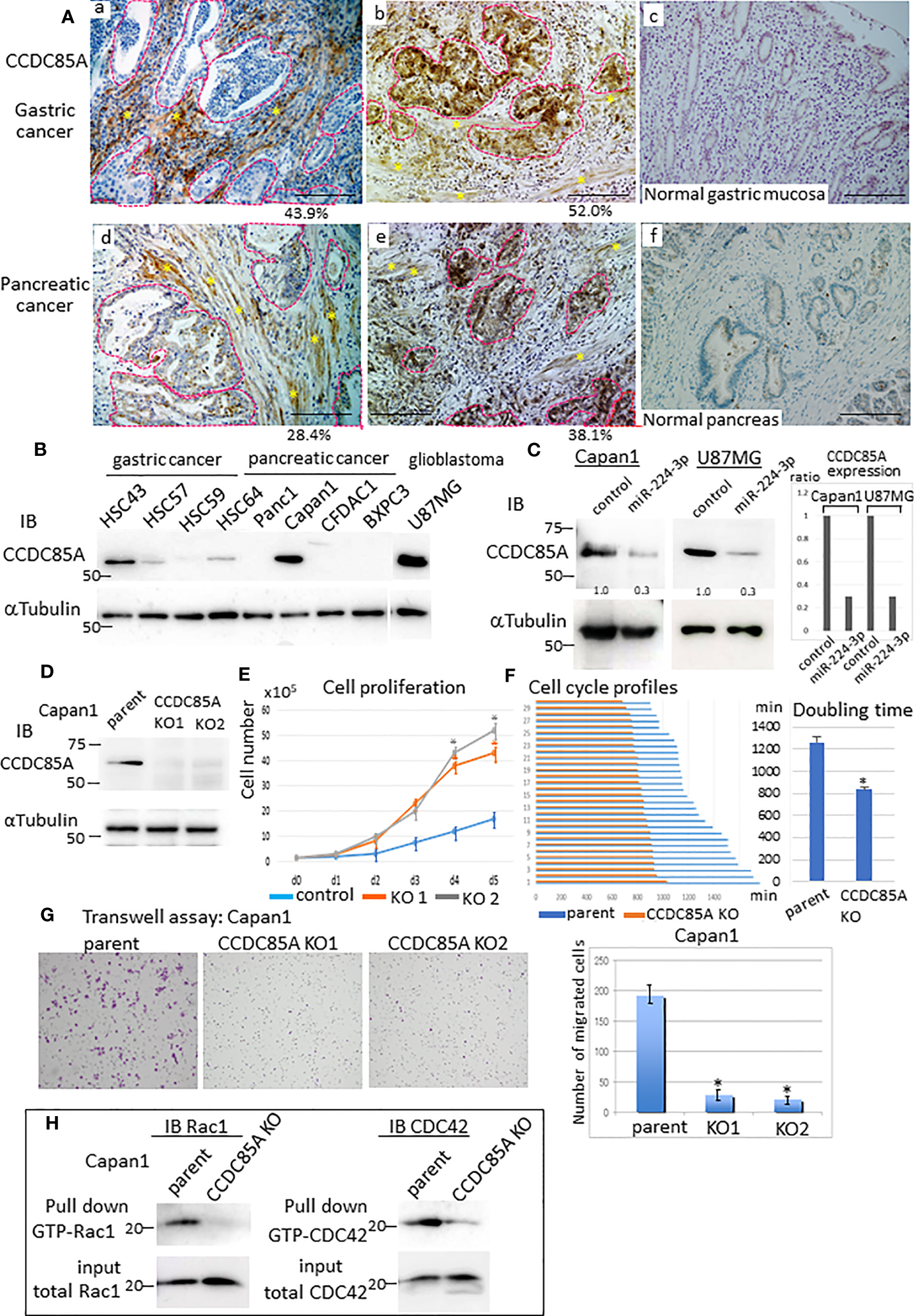 Increased expression of CCDC85A in tumors promotes cancer cell migration and invasion. (A) Immunohistochemical analysis of CCDC85A in human gastric cancer (top panels) and pancreatic cancer specimens (bottom panels). Representative cancer cell nests are demarcated by dotted lines (red), and CAF regions are marked by asterisks. Normal regions (c, f) are shown to the right of each image. Representative images are shown. Bar, 100 μm. Percentage of CCDC85A positive area/total area in each specimen was shown in the bottom. Example of the quantification of each area was shown in Figure S2D. (B) Expression of CCDC85A by cancer cells was examined by western blot analysis. (C) Capan1 and U87MG cells were transfected with the control or miR-224-3p miRIDIAN and subjected to western blot analysis to detect expression of CCDC85A. Right: Intensity of each band was quantified, and expression of CCDC85A was normalized by 〈−Tubulin, and expressed as the relative ratio to the control miRNA transfected cells. (D) Capan1 parent cells or CCDC85A knockout cells were examined for CCDC85A expression by western blotting. KO1 and KO2 indicate two independent clones. (E) Proliferation of Capan1 parent cells (control) or CCDC85AKO cells was evaluated by counting the cells under standard culture conditions. Data points indicate the average results from three dishes. *P < 0.01. (F) Cells were time-lapse monitored to evaluate the cell cycle morphologically. Bar graph indicates the cell cycle (duration (min) of M phase to M phase) of 30 individual cells of each control and CCDC85AKO. (Right) Graph indicates the average results of each 30 individual cells. *P < 0.01. (G) Transwell assay of Capan1 parent cells or CCDC85A knockout cells. The number of migrated cells (shown on the right) was counted in three independent experiments. *P < 0.01. (H) Cell lysates were prepared from cancer cells, pulled-down by GST-PBD, and then immunoblotted with anti-Rac1 or anti-CDC42 to detect GTP-bound Rac1 or CDC42 (activated). Expression of total Rac1 or CDC42 in the input is shown at the bottom. a, b, d, e are individual different patients.