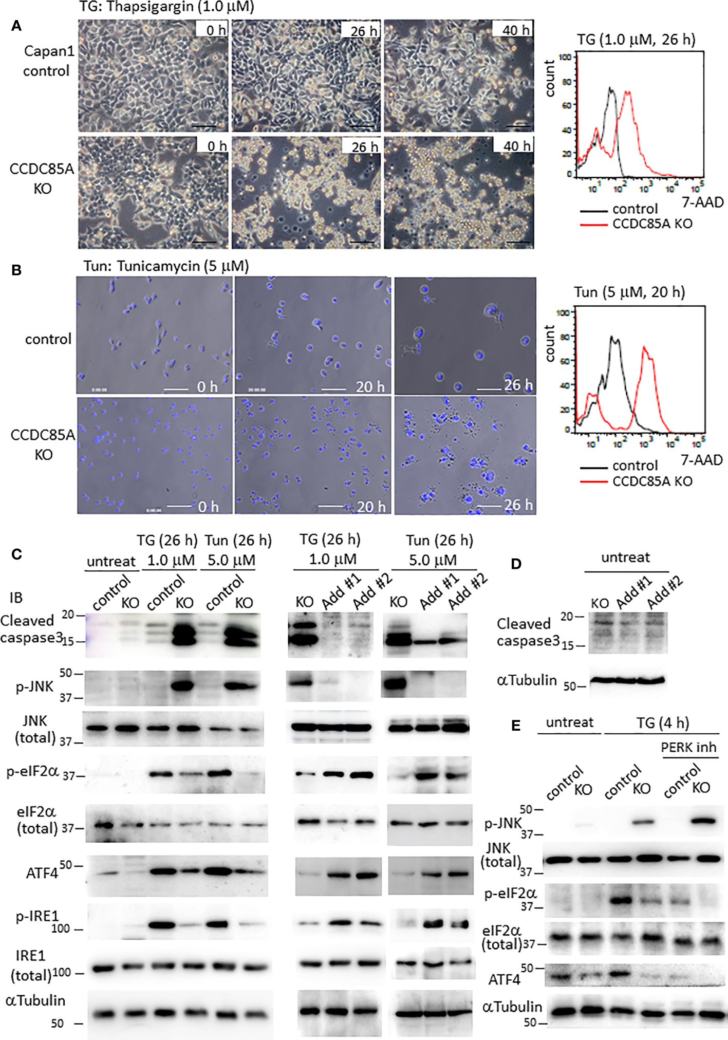Resistance of cancer cells to chemotherapeutic agents such as cisplatin is a major problem, and this phenomenon is affected by cellular responses to ER stress. Treatment with ER stress activators thapsigargin (TG) or tunicamycin (Tun) triggered apoptosis in Capan1 CCDC85AKO cells to a greater extent than in control cells (Figures 4A, B). Consistent with this, TG and Tun induced expression of cleaved caspase-3 and activation (phosphorylation) of JNK in Capan1KO cells; however, this was far less evident in Capan1 control cells under the same conditions (Figure 4C; left panel).