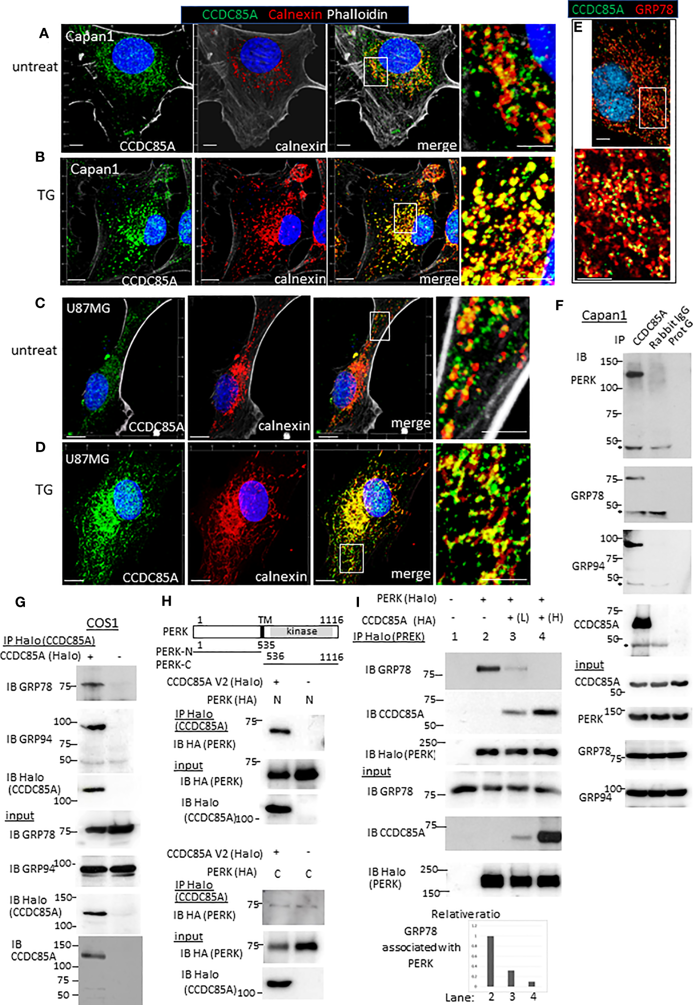 CCDC85A localizes in the ER and disrupts the interaction between PERK and GRP78/GRP94. (A–D) Capan1 (A, B) or U87MG cells (C, D) were treated with TG (B, 1 μM to Capan1; D, 5 μM to U87MG) for 24 h or left untreated. Cells were fixed and immunostained with anti-CCDC85A (green), anti-calnexin (red) antibodies, and phalloidin (white) as indicated above the panel. Bar, 10 μm. The boxed areas are enlarged to the right of each panel (Bar, 5 μm). (E) Capan1 cells were immunostained with anti-CCDC85A (green) and anti-GRP78 (red) antibodies. (F) Cell lysates of Capan1 were immunoprecipitated by an anti-CCDC85A antibody or rabbit IgG control antibody, or protein-G agarose alone and coprecipitated PERK, GRP78 or GRP94 was detected by each antibody. Asterisk indicates the heavy chain of IgG. (G) COS1 cells were transiently transfected with the plasmids encoding CCDC85A tagged with Halo at C-terminus. Cell lysates were prepared 30 h after transfection and subjected to immunoprecipitation (IP) of CCDC85A using Halo-tag magnetic beads. Coprecipitated endogenous GRP78 or GRP94 was detected by each antibody. Expression of transfected genes in cell lysates (input) is shown in the bottom panels. (H) Protein lysates of COS1 cells transfected with C-terminally HA-tagged PERK deletion mutant forms (illustrated at the top) and CCDC85A-Halo were subjected for IP to detect CCDC85A; coprecipitated PERK deletion forms were detected by an anti-HA antibody. Weak bands observed in the bottom panel indicate the background level of coprecipitated PERK-C. (I) COS1 cells were transfected with the plasmids indicated above the lanes. Lanes 3 and 4 contain lysates of cells transfected with increasing amounts of CCDC85A tagged with HA. PERK was immunoprecipitated by Halo magnetic beads, and coprecipitated endogenous GRP78 and transfected CCDC85A were detected by anti-PERK or anti-CCDC85A antibody. [(I), bottom] The intensity of the bands representing coprecipitated GRP78 was measured and normalized to the intensity of input GRP78. The results are expressed as a relative ratio.