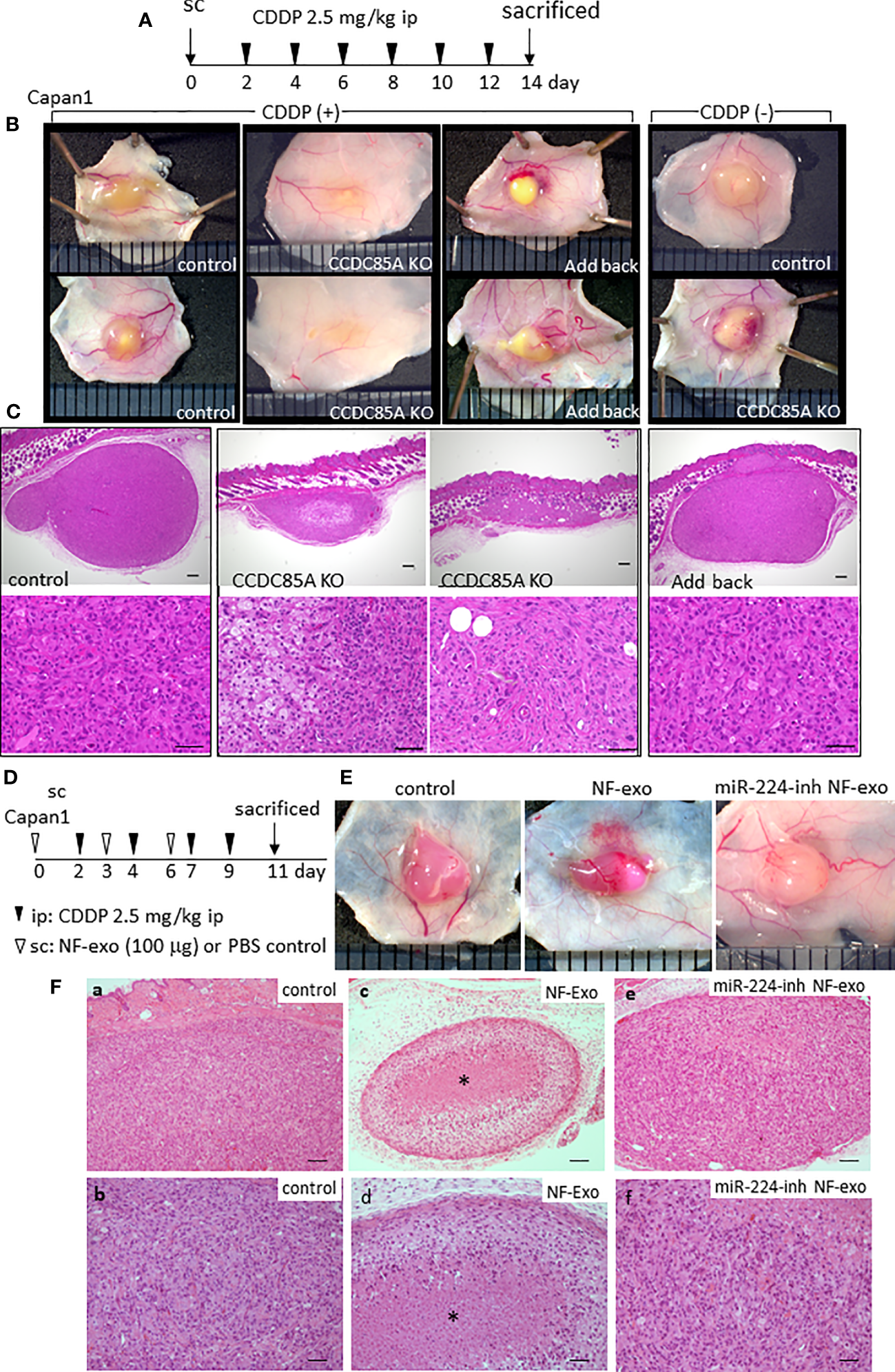 CCDC85A promotes the resistance of tumors against cisplatin treatment. (A) Capan1 control, CCDC85AKO, or addback cells were injected subcutaneously into 6-week-old nude mice and treated by CDDP as described in Materials and Methods, and sacrificed at day 14. (B) Representative appearance of the tumors. Tumors in mice without CDDP treatment were shown at the right. (C) Tumors were excised, fixed, and the maximum cut surface was subjected to H&E staining. Representative images are shown. Bar; 200 μm (upper panels), 50 μm (lower panels). Five mice were examined in each group. (D) Capan1 cells (1×106) were subcutaneously injected with or without NF-exo (100 μg), and treated by CDDP as above. NF-exo was purchased as indicated by injecting into the tumor. (E) Representative images of tumors. miR-224-inh NF-exo: Exosomes were collected from NFs transfected with miR-224-3p inhibitor. (F) H&E staining of the maximum cut surface of each tumor, as described in (C) Bar; 100 μm (upper panels), 50 μm (lower panels). Bottom panels (b, d, f) are enlarged images of a, c, e, respectively. Asterisk indicates the nest of dead cancer cells. Five mice were examined per group, and representative results are shown.