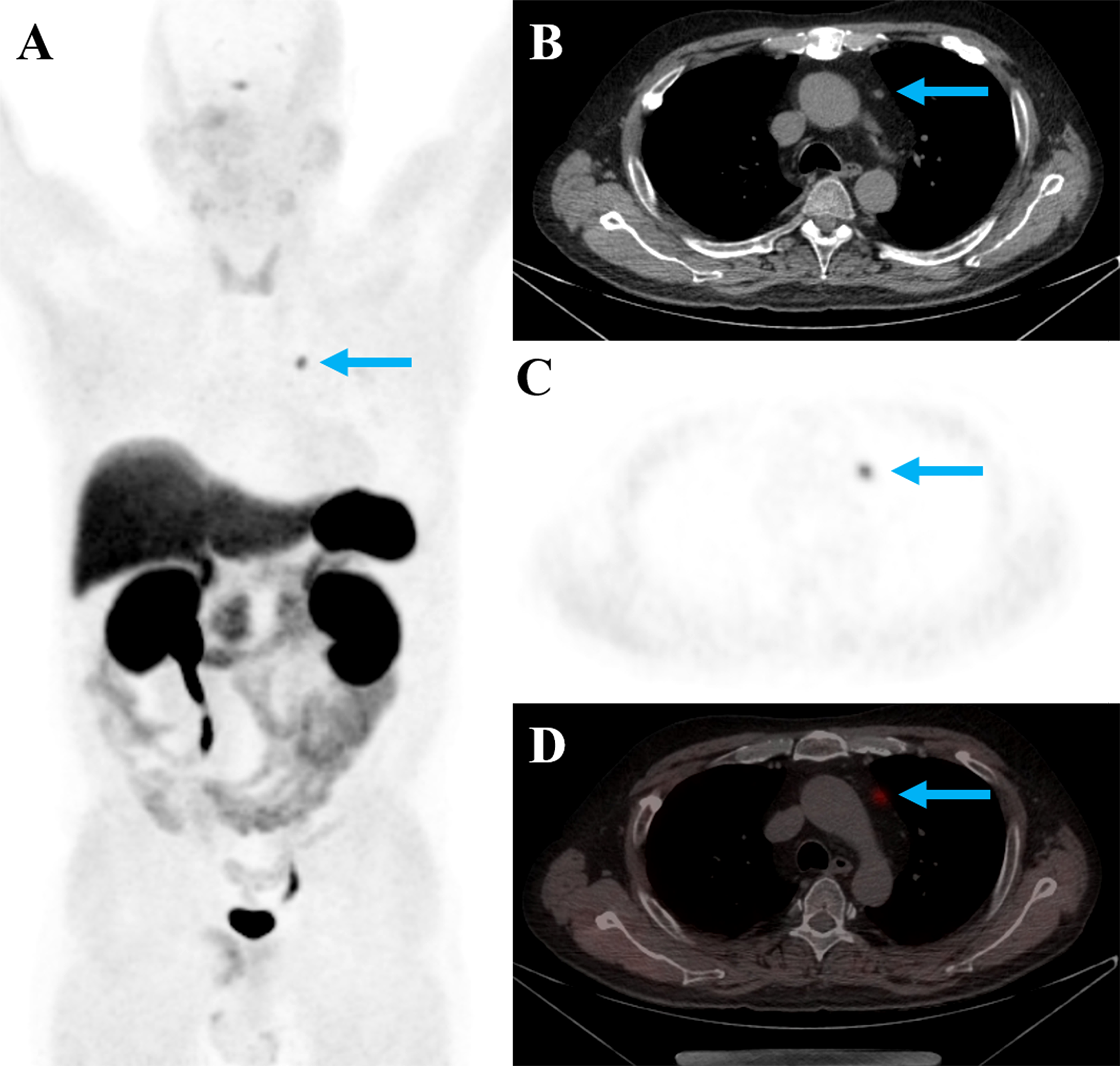 A 53-year-old man with EAS showed positive 68Ga-DOTATATE uptake in the thymic nodule (A–D, blue arrows; tumor SUVmax: 5.2; tumor size: 0.5cm). The nodule was surgically resected, and was pathologically confirmed to be thymic neuroendocrine tumor (G1, Ki-67 index, 1%).