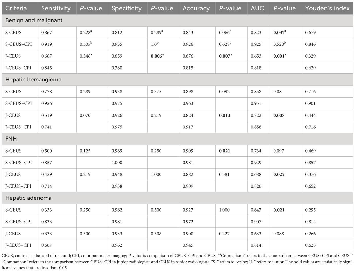 Diagnostic performance of CEUS and CEUS+CPI for benign FLLs