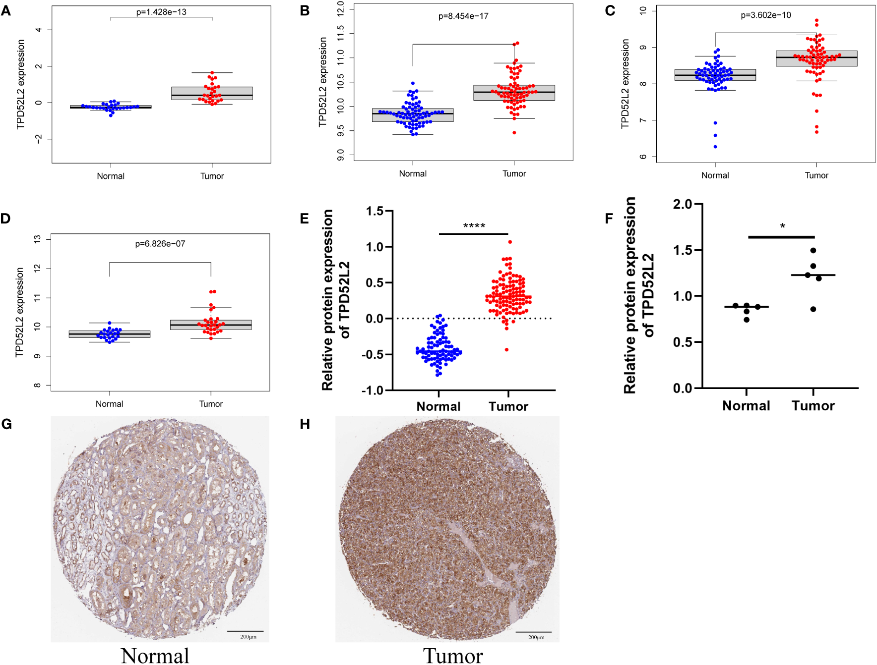 Figure 3 The mRNA and protein expression patterns of TPD52L2 in ccRCC tissues and cells. (A–D) TPD52L2 is up regulated in ccRCC tissues based on GSE36895, GSE46699, GSE57357 and GSE66272, respectively; (E) Differential protein expression of TPD52L2 in ccRCC tissues based on CPTAC; (F) Differences of TPD52L2 in 5 pairs of ccRCC and adjacent tissues proteomic sequencing results; (G, H) Protein expression of TPD52L2 based on immunohistochemical results in HPA. *P<0.05, ****P<0.0001.