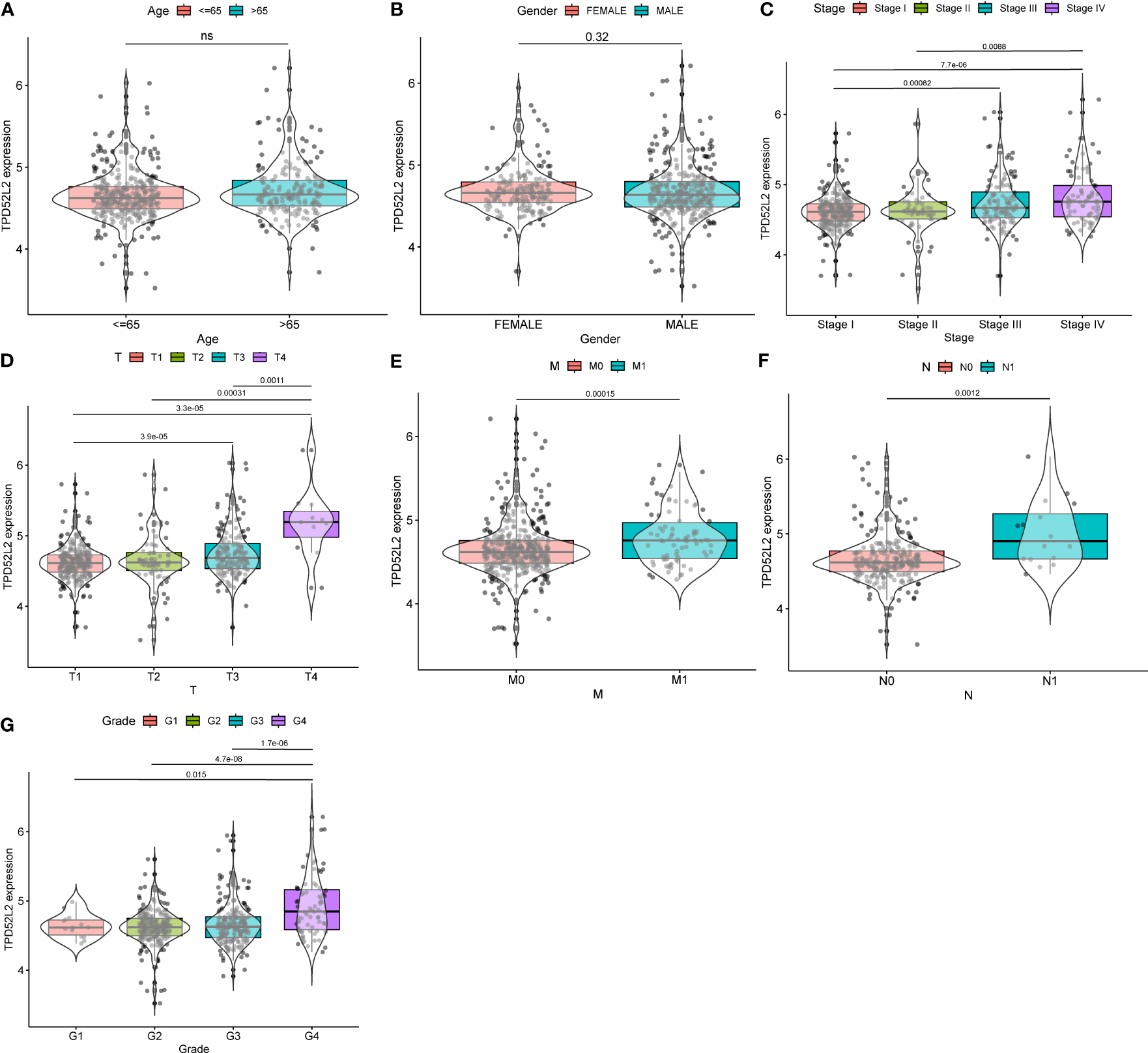 Figure 4 The relationship between TPD52L2 expression and clinical characteristics of ccRCC based on TCGA. (A) Age, (B) Gender, (C) Stage, (D) T stage, (E) M stage, (F) N stage, (G) Grade. ns, no significance.