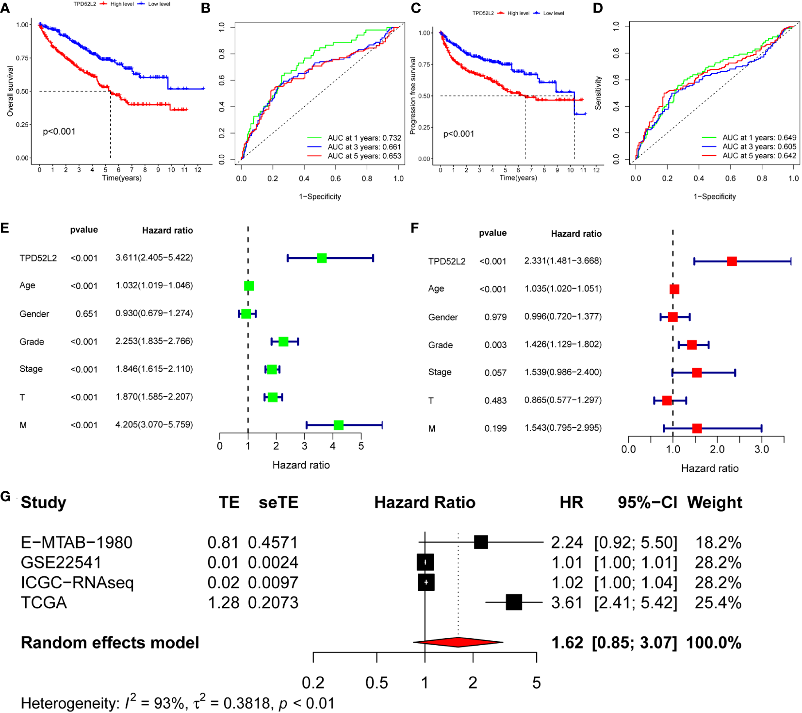 Figure 5 The value of TPD52L2 on the prognosis of ccRCC patients. (A) Relationship between TPD52L2 expression and overall survival (OS) of ccRCC; (B) Diagnostic value of TPD52L2 on 1-year, 3-year, and 5-year OS in ccRCC patients; (C) Relationship between TPD52L2 expression and progression free survival (PFS) in ccRCC patients; (D) Diagnostic value of TPD52L2 on 1-year, 3-year, and 5-year PFS in ccRCC patients; (E) Univariate analysis on clinical characteristics of ccRCC based on TCGA; (F) Multivariate analysis on clinical characteristics of ccRCC based on TCGA; (G) The meta-analysis of TPD52L2 prognostic value based on TCGA, GSE22541,ICGC and E−MTAB−1980.