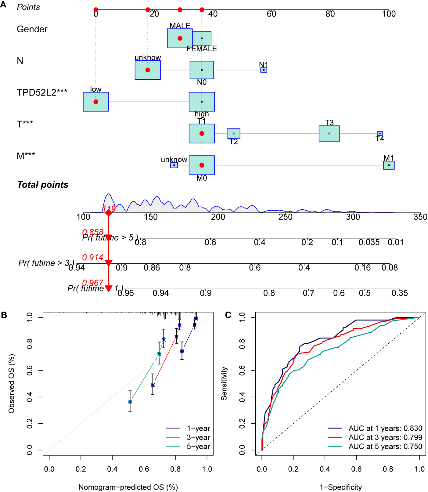 Figure 6 Constructing and validating nomograms. (A) Nomogram for predicting the 1,3 and 5-year OS of ccRCC patients; (B) calibration of the nomogram at 1,3 and 5-year survival; (C) ROC curves to predict the sensitivity and specificity of 1-, 3-, and 5-year OS according to the nomogram. ***P<0.001.