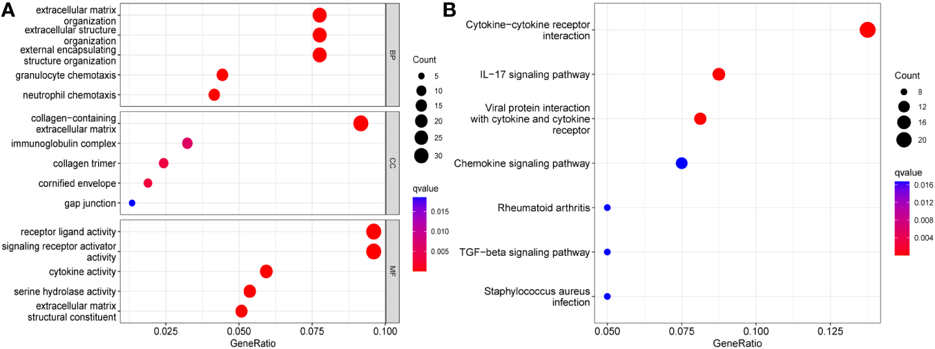 Changes in the expression of individual genes are often involved in the pathological process of the disease by triggering changes in regulatory axes or signaling pathways. To clarify the role played by TPD52L2 in the pathological process of ccRCC, a functional enrichment analysis was performed in this study. First, ccRCC samples were divided into high and low expression groups according to TPD52L2 expression. After differential analysis of the samples in the two groups, a total of 534 differentially expressed genes (DEGs) were obtained, as shown in Data Sheet 1. Subsequently, GO and KEGG analyses were performed on DEGs, and the results are shown in Figures 8A, B. GO functional analysis showed that the main biological processes enriched in DEGs were extracellular matrix and immune activity; the main cellular components included collagen and immune proteins; the main molecular functions included cell receptor activity and cytokine activity, etc. The results of KEGG pathway analysis showed that the main signaling pathways enriched by DEGs include Cytokine-cytokine receptor interactions, PI3K-Akt signaling pathway, IL-17 signaling pathway, Wnt signaling pathway, Hippo signaling pathway and ECM-receptor interactions. These pathways are involved in the invasion of tumor cells and immune regulation, indicating that the abnormally high expression of TPD52L2 plays an important role in the tumor progression and TME.