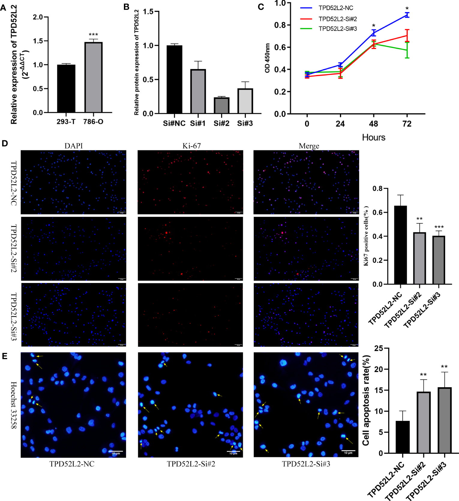 Figure 12 Effect of TPD52L2 on proliferation and apoptosis of 786-O cells. (A) RT-qPCR to clarify the expression level of TPD52L2 in 786-O; (B) RT-qPCR to detect si-RNA transfection efficiency; (C) CCK8 assay to detect the change on proliferation ability after knockdown of TPD52L2; (D) Immunofluorescence to detect the difference of KI-67 expression; (E) Hoechst 33258 detects changes in apoptosis. *P<0.05, **P<0.01, ***P<0.001.