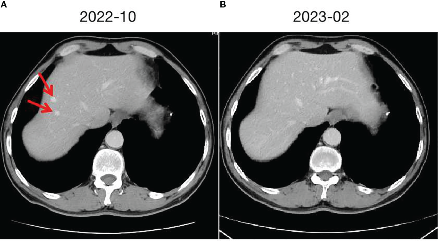 In September 2020, a middle-aged male presented to the hospital with dizziness and headaches. Brain MRI revealed an abnormal mass in the brain, suggestive of a metastatic tumor. Apart from neurological symptoms, there is mild cough without sputum, no chest tightness or chest pain, no fever or sweating, no diarrhea or constipation. The patient has a history of hypertension for 10 years. The highest recorded blood pressure was 175/105mmHg. Currently, the patient is taking oral antihypertensive medication (Valsartan capsules, 80mg/d), and the blood pressure is controlled within the range of 130-140/90-100mmHg. No cerebrovascular diseases or coronary artery disease. The patient denies any infectious diseases such as hepatitis or enteritis. There is no history of trauma, surgery, or blood transfusion. No known food or drug allergies. The patient has a smoking history of 35 years, consuming 10 cigarettes per day. Occasional alcohol consumption.Vital signs are stable. Specifically:H 177cm, W 60kg, HR 91/min, BP 137/95mmHg.Laboratory tests: WBC 7.64×109/L (4-10×109/L), RBC 5.17×1012/L (4-5.5×1012/L), Hb 128g/L (120-160g/L), PLT 232×109/L (100-300×109/L), CEA 103.6ng/ml↑ (<3.4ng/ml), CA24-2 63U/ml↑ (<15U/ml), other tumor markers are within normal range. Further evaluation with whole-body PET/CT indicated a lesion in the left lung measuring 40×35mm, accompanied by lymph node and mediastinal metastasis, as well as multiple brain metastases. A CT-guided biopsy was performed on the lesion in the left lung, and the pathological analysis indicated poorly differentiated adenocarcinoma. A 10-gene test for lung cancer revealed a KRAS missense mutation (G13D, 13.91%), while no mutations were found in the remaining genes (EGFR, ALK, ROS1, BRAF, NRAS, HER2, PIK3CA, RET, MET). The PD-L1 positivity rate was 10%.The clinical stage is cT2N2M1, stage IV. A multidisciplinary consultation within the hospital was conducted, considering the patient’s current multiple brain metastases and significant symptoms. It was recommended to prioritize whole-brain radiation therapy (WBRT) and symptomatic treatments such as intracranial pressure reduction and nutritional support. After symptom control, systemic treatment and radiation therapy for the primary lesion were suggested. Consequently, from October 2020 to November 2020, the patient received WBRT using 6MV X-rays, delivering a dose of 30Gy/10f/2w to 95% of the planning target volume (PTV). During this period, treatment for dehydration and intracranial pressure reduction was administered. Following the completion of radiation therapy, the patient experienced a significant improvement in symptoms, including reduced dizziness and headaches. The ECOG PS improved from a score of 3 to 1.Although the patient was initially diagnosed with stage IV disease, distant metastases were limited to the intracranial region. After receiving cranial radiation therapy and supportive care, the intracranial lesions were well controlled, and the patient’s general condition remained good. The patient expressed a strong willingness for treatment. Taking reference from the KEYNOTE189 and CAMEL studies, after discussing with the patient, a systemic treatment regimen comprising platinum-based doublet chemotherapy in combination with PD-1 inhibitor was administered. From December 2020 to June 2021, the patient received 8 cycles of the PP regimen chemotherapy (Pemetrexed 500mg/m² iv day 1, Carboplatin AUC5 iv day 1, every 3 weeks) combined with PD-1 inhibitor therapy (Camrelizumab 200mg, every 3 weeks). During the second to fourth cycles of treatment, concurrent radiotherapy was administered. The specific radiotherapy plan consisted of 6MV X-rays, delivering a dose of 60Gy/30f/6w to 95% of the planning target volume (PTV), and the treatment toxicity was tolerable. Following the completion of concurrent chemoradiotherapy, the therapeutic evaluation of the primary lesion in the chest and intracranial lesions, according to RECIST v1.1 criteria, showed a partial response (PR). Maintenance treatment was initiated in July 2021, with the following regimen: Pemetrexed 500mg/m² iv day 1, Bevacizumab 500mg iv day 1, and Camrelizumab 200mg every 3 weeks. Regular follow-up examinations were conducted every 2 months, and the therapeutic evaluation remained stable disease (SD). In October 2022, a liver nodule was discovered in the left liver lobe on abdominal CT (Figure 2A). A further ultrasound-guided biopsy was performed, and the pathological results confirmed hepatic cavernous hemangioma. Similar to the previous patient, a multidisciplinary consultation was conducted, and it was determined that the liver nodule was likely a drug reaction to Camrelizumab. Therefore, Camrelizumab was discontinued starting from November 2022, and maintenance treatment with Pemetrexed and Bevacizumab was initiated using the same dosage and cycle as before. Subsequently, the hepatic cavernous hemangioma disappeared (Figure 2B), and no further drug-related adverse reactions occurred. The clinical response continued to be evaluated as stable disease (SD).