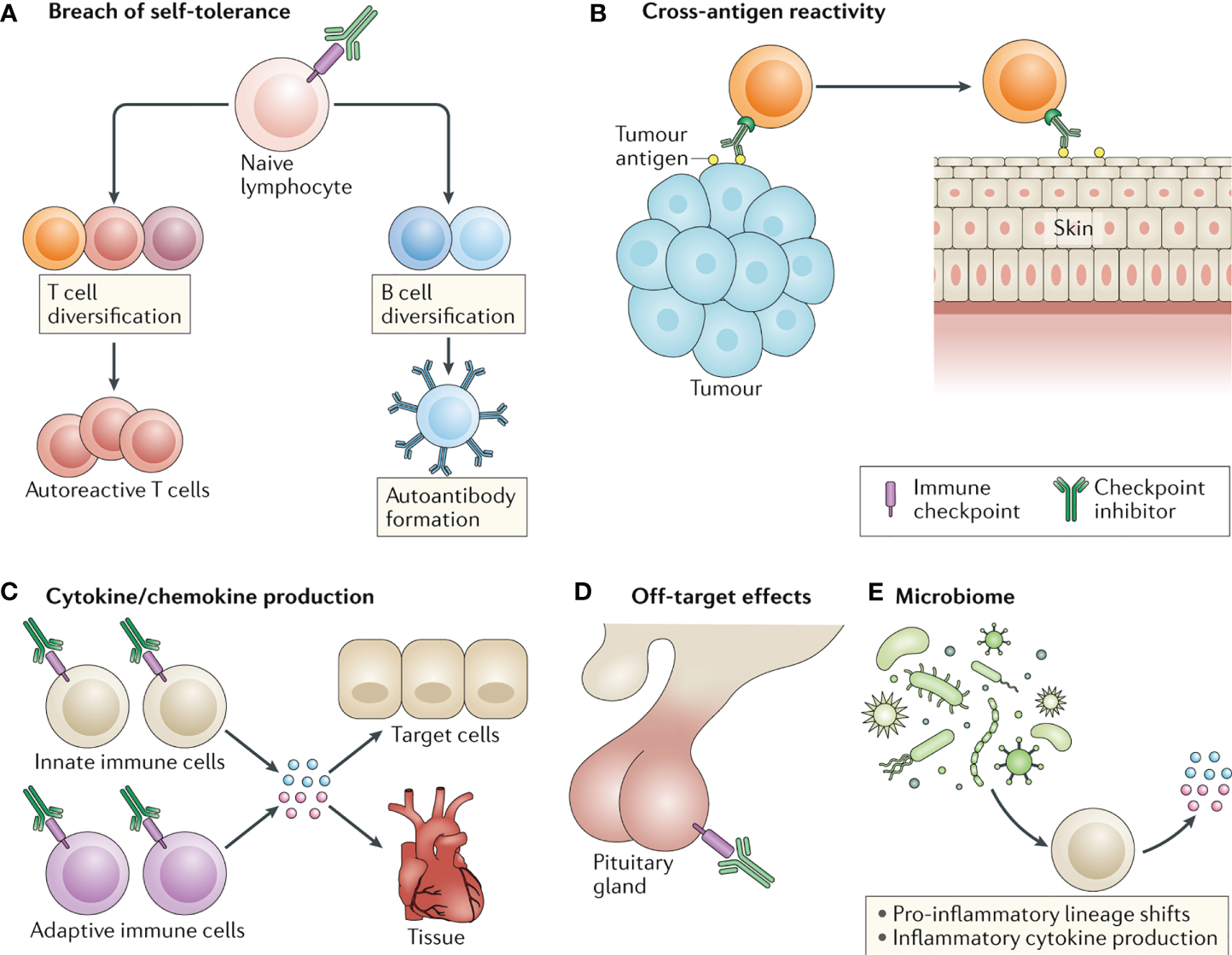 Four common molecular mechanisms underlying the development of irAEs induced by ICIs. (A. disruption of self-immune tolerance; B. cross-reactivity; C. release of cytokines; D. off-target effects).