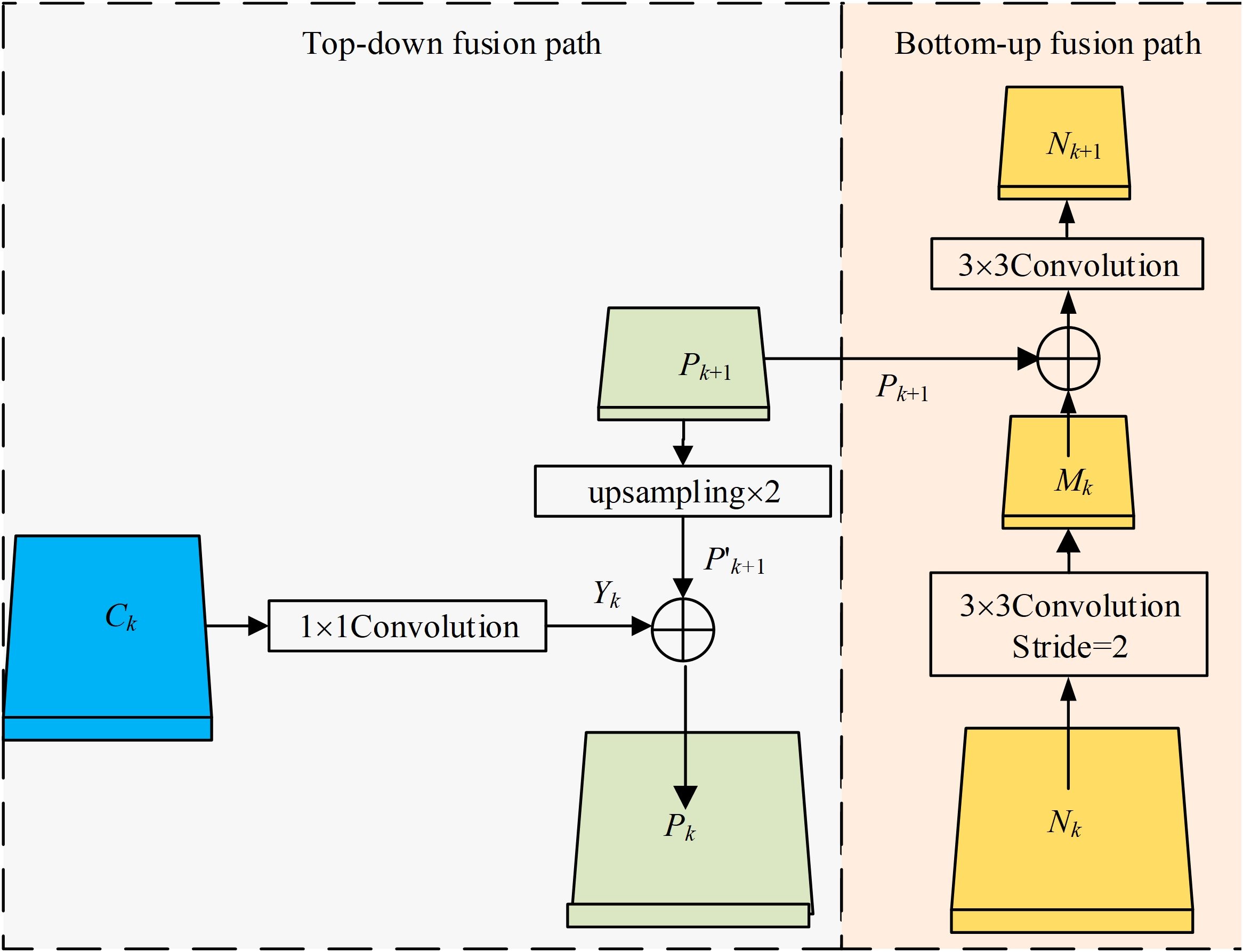 The process of the bottom-up feature fusion: First, feature map Nk from the shallow layers is downsampled twice by a convolution to obtain the feature map Mkof the same size as Pk+1. Second, pixelwise addition of Pk+1 and Mk is performed, followed by a 3 × 3 convolution, thereby better achieving the feature fusion. Finally, Nk+1 is obtained, where all N5, N4, and N3 have 256 channels. N6 and N7 are obtained from N5 and N7 by downsampling, respectively.