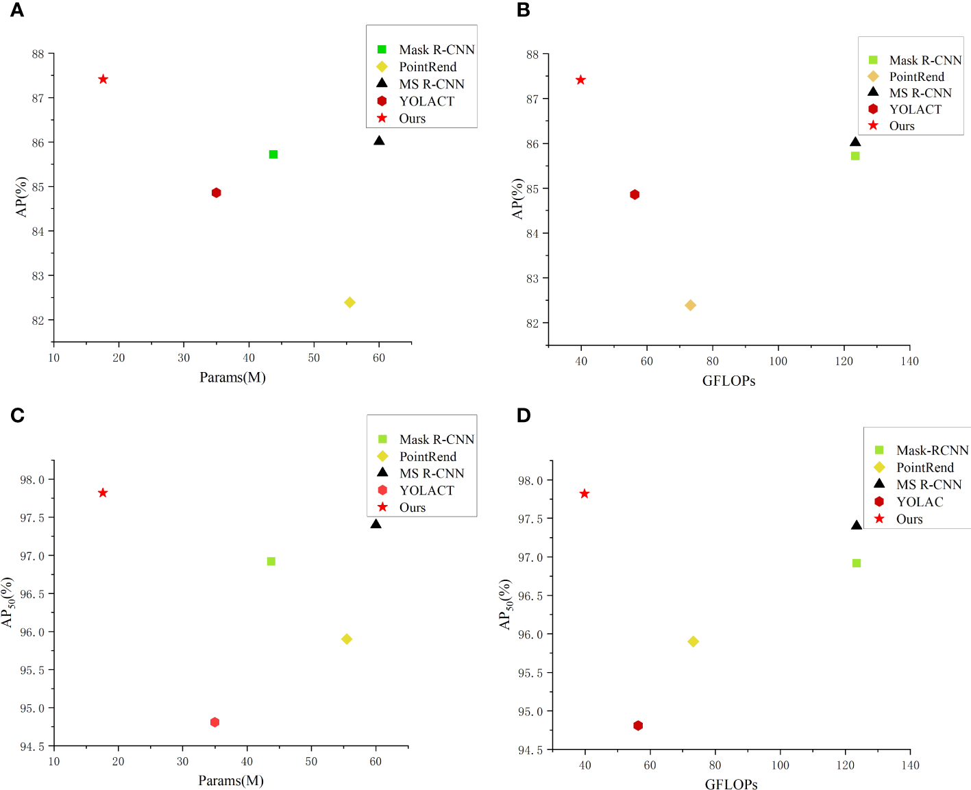 Our method is significantly better than the current state-of-the-art single-stage methods in terms of both the number of parameters and FLOPs, and our method has the best performance among all compared methods. However, the performance of our method is still lower than the two-stage instance segmentation algorithms. in future work, how to design a more lightweight network model while ensuring a good accuracy will become an important problem.