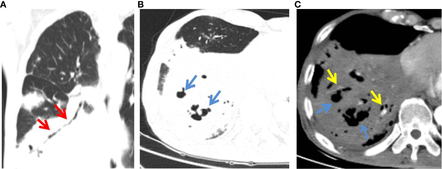 C-MALT lymphoma in a 58-year-old woman with right back pain for 2 weeks. (A) Lung-window HRCT multi-planar reconstruction showed a consolidation with air bronchogram (red arrow) in the right lower lobe. (B) There was cystic bronchiectasis (blue arrow) within the lesion. (C)Â Mediastinum-window showed consolidation with cystic bronchiectasis (blue arrow) and angiogram sign (yellow arrow). HRCT, high-resolution computed tomography; C-MALT, consolidation pattern of pulmonary mucosa-associated lymphoid tissue.