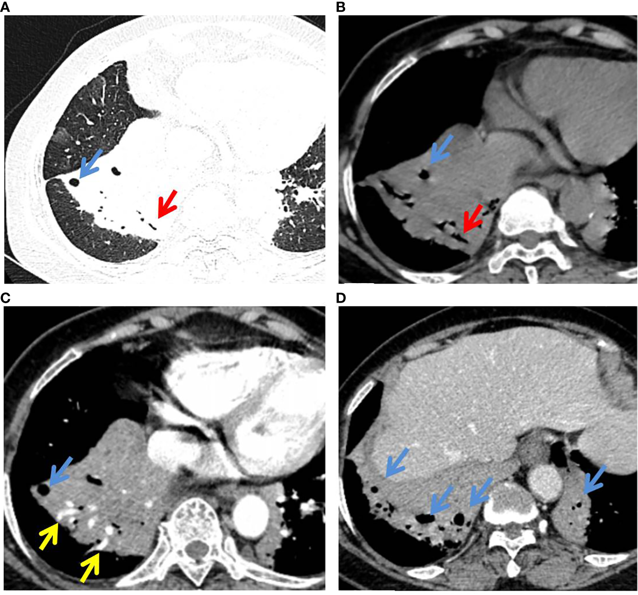 P-MALT lymphoma in a 66-year-old with a cough for 14 days. (A) Axial CT image of the lung window indicated multiple consolidations with air bronchogram (red arrow) and cystic bronchiectasis (blue arrow) in the left lower lobe and right lower lobe. (B–D) Mediastinum-window in the plain scan, arterial phase, and venous phase showed air bronchogram (red arrow), cystic bronchiectasis (blue arrow), and angiogram sign (yellow arrow) within the lesions. CT, computed tomography; C-MALT, consolidation pattern of pulmonary mucosa-associated lymphoid tissue.