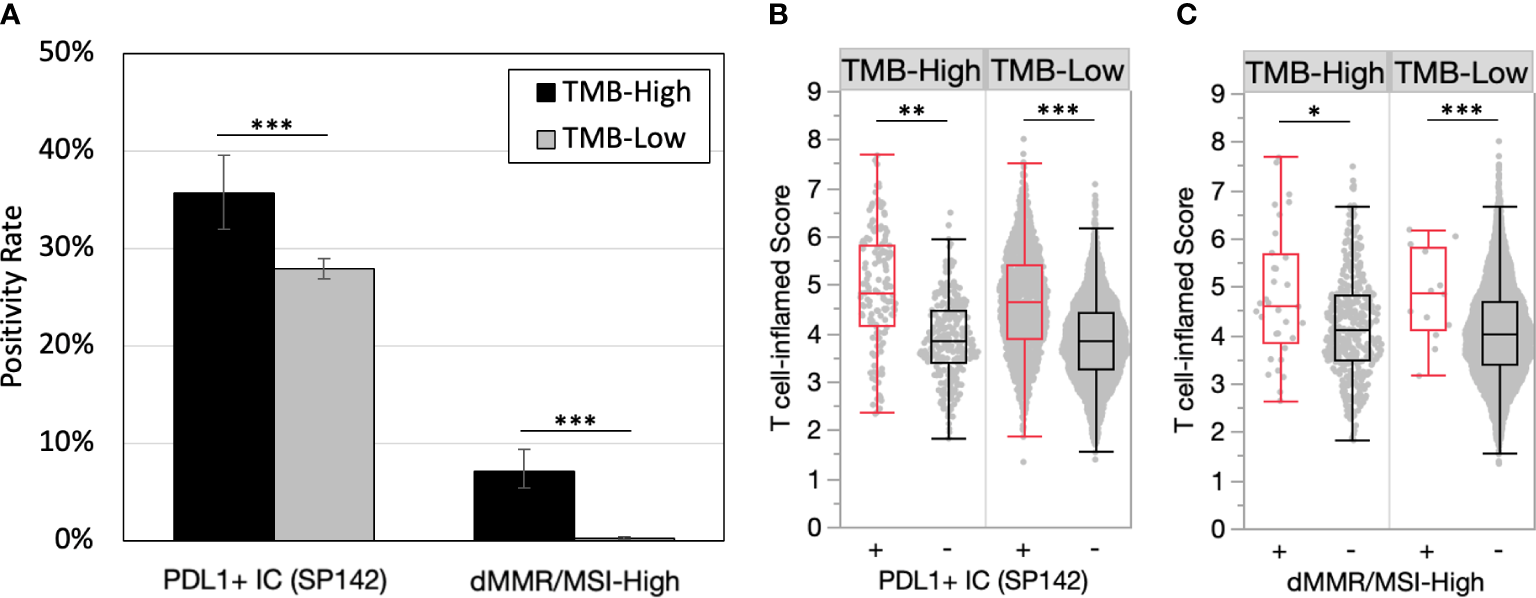 PD-L1 positivity and microsatellite instability are enriched in TMB-H tumors and predict inflamed TMEs. (A) PD-L1+ immune cells (IC) (SP142) and dMMR/MSI-High positivity rates in TMB-H and TMB-L tumors. (B-C) T cell-inflamed scores in by PD-L1+ IC (SP142) (B) and dMMR/MSI-High status (C). *P<0.05, **P<0.01, ***P<0.001.