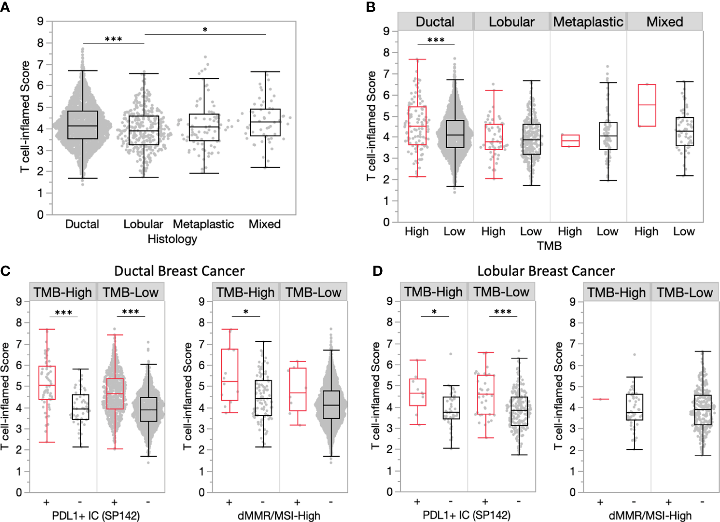 Ductal tumors have more inflamed TMEs compared to lobular tumors. (A) T cell-inflamed scores in ductal and lobular subgroups. (B) T cell-inflamed scores in TMB-H and TMB-L tumors by histology. (C-D) T cell-inflamed scores in TMB-H and TMB-L ductal (C) and lobular (D) subgroups further stratified by PD-L1+ immune cells (IC) (SP142) and dMMR/MSI-High status. *P<0.05, ***P<0.001.