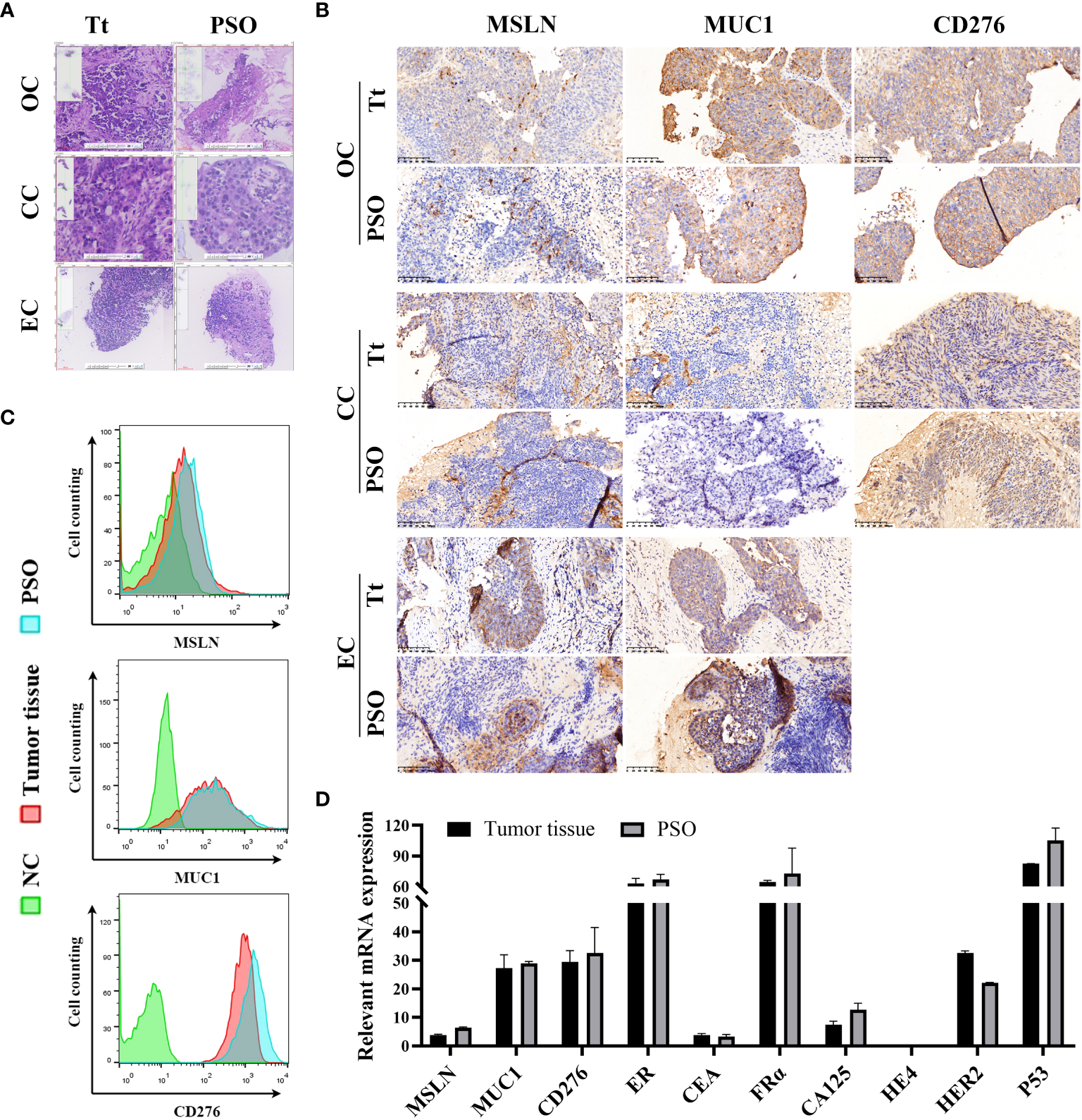 Similar properties between PSO and tumor tissue. (A, B) Our study utilized H&E staining (A) and IHC staining (B) to compare PSOs obtained from different gynecologic cancers to their corresponding tumor tissues. (C) We also conducted cell counting to determine the number of MSLN, MUC1, and CD276 positive cells in the PSO from ovarian cancer and the corresponding tumor tissue. Negative controls were cells that lacked relevant protein expression. (D) In addition, we analyzed relevant mRNA expression levels in the PSO obtained from ovarian cancer and the corresponding tumor tissue. Abbreviations used in this study include Tt (tumor tissue), OC (ovarian cancer), CC (cervical cancer), EC (endometrial cancer), and NC (negative control).