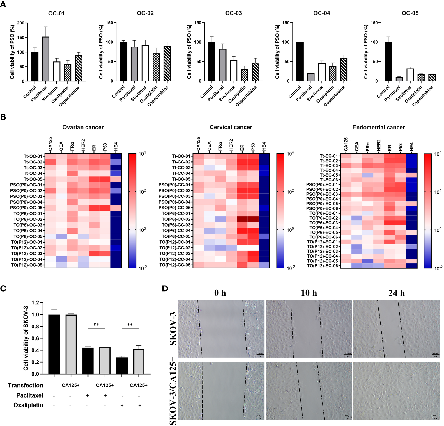 The potential of PSO for pre-clinical drug screening or future investigation. (A) To mimic pre-clinical drug screening, we used PSOs obtained from different ovarian cancer patients and treated them with paclitaxel (5μM), sirolimus (0.5μM) oxaliplatin (10μM) and capecitabine (1μM) for 7 days. (B) We also analyzed the relevant mRNA expression patterns of the tumor tissue, PSO, and traditional organoid at P6 or P12 from each of the patients with ovarian cancer (5 donors), cervical cancer (5 donors), or endometrial cancer (6 donors). (C) In addition, we evaluated the cell viability of SKOV-3 with or without CA125 overexpression after treatment with paclitaxel or oxaliplatin. The results were normalized to the control group, which was assigned a value of 1.0. (D) Lastly, we conducted a wound healing test of SKOV-3 with or without CA125 overexpression, and recorded the snap point at the 0th, 10th, and 24th hour. Abbreviations used in this study include Tt (tumor tissue), TO (traditional organoid), OC (ovarian cancer), CC (cervical cancer), EC (endometrial cancer), and SKOV-3/CA125+ (SKOV-3 with CA125 overexpression). “**”, statistically significant difference with the value of p < 0.01. “ns”, statistically unsignificant difference.